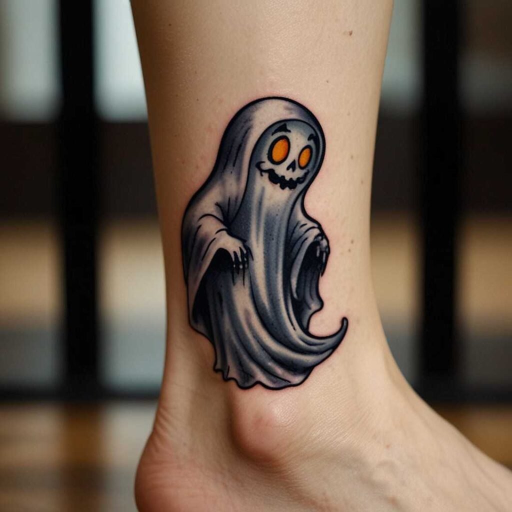 This design features the classic ghost with a sheet-like appearance, reminiscent of old cartoons. It’s a nod to vintage pop culture and Halloween nostalgia. The traditional sheet ghost tattoo often symbolizes the playful side of fear and the unknown. Its simplicity allows for quick ink, and it looks great on small spaces like the wrist or ankle. It’s a fun tattoo for anyone who loves Halloween or enjoys a touch of retro charm.
