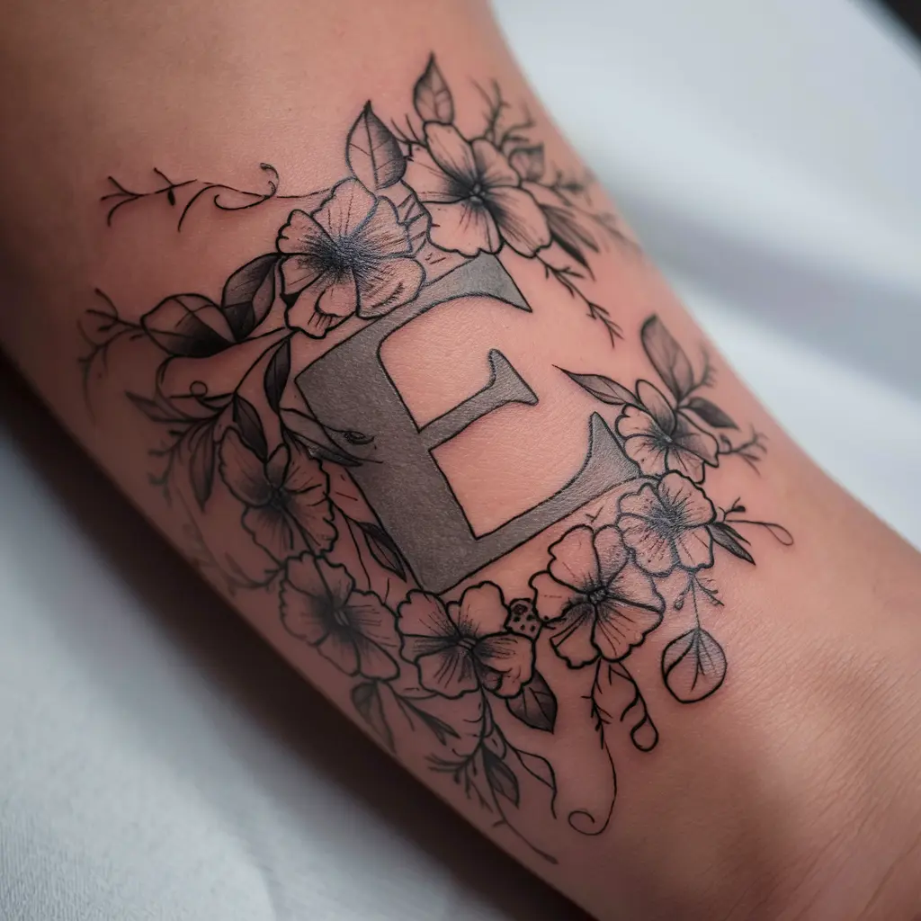 Meaning: The letter “E” formed with delicate flowers and vines symbolizes growth, beauty, and a connection to nature. It’s a perfect choice for someone who wants their tattoo to reflect personal growth or their love for nature.