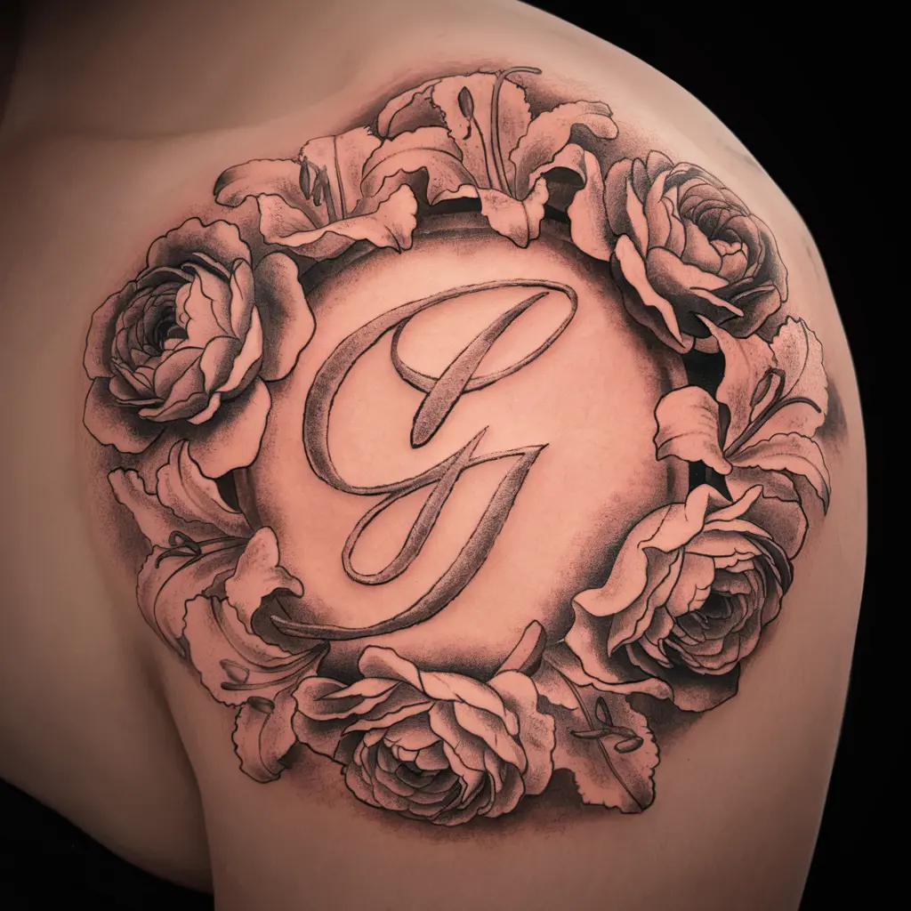 Personalized Description: Imagine a delicate “G” surrounded by soft, detailed flowers like roses or lilies. It’s both elegant and feminine.