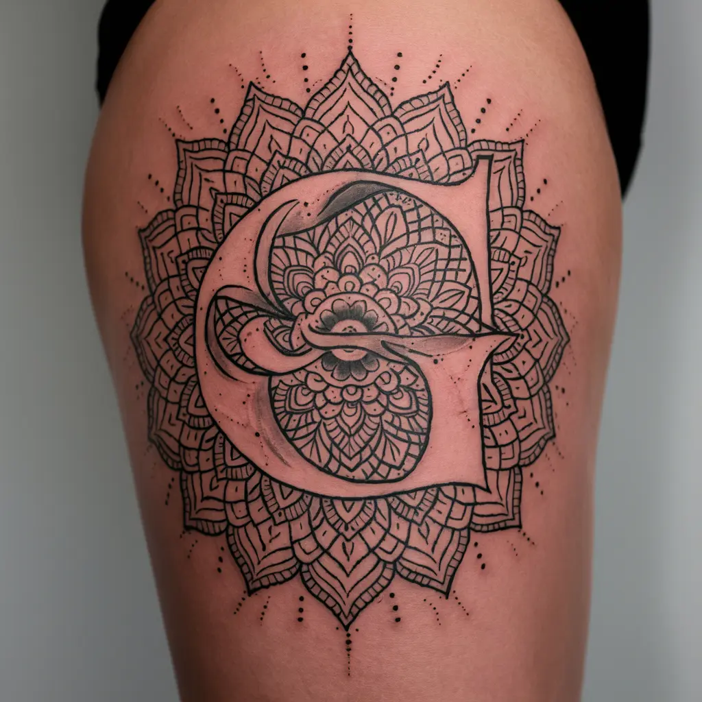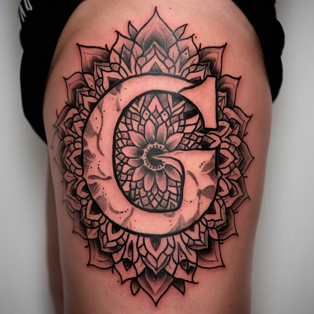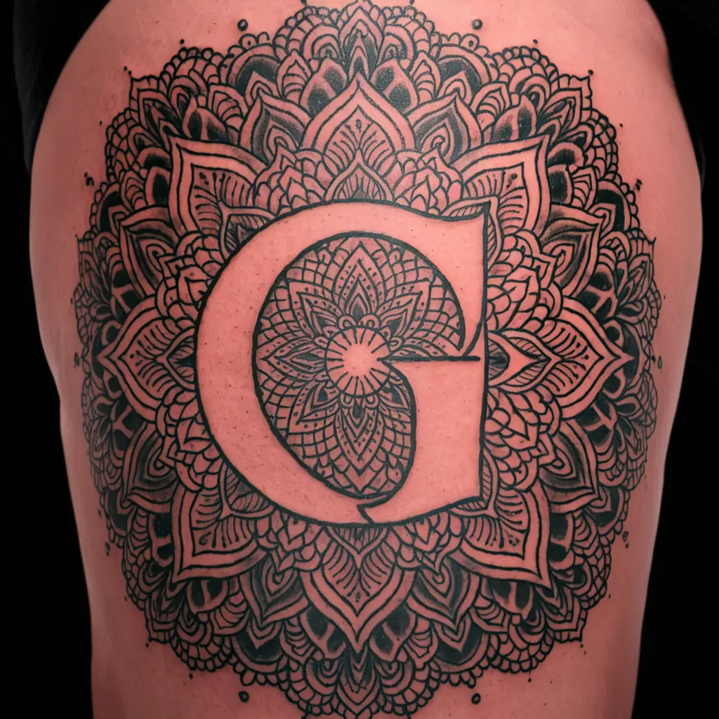 Personalized Description: This tattoo combines the letter “G” with intricate mandala patterns, creating a spiritual and calming design.