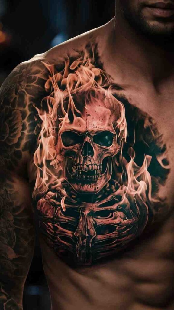 This tattoo shows a skull engulfed in flames, representing destruction and rebirth. It’s a dynamic design, perfect for Halloween. The flames add movement and intensity, making the skull look fierce and powerful. It’s a great choice for those who want a bold, fiery tattoo. The combination of fire and skull makes it both striking and symbolic. Ideal for anyone who loves intense, energetic designs.