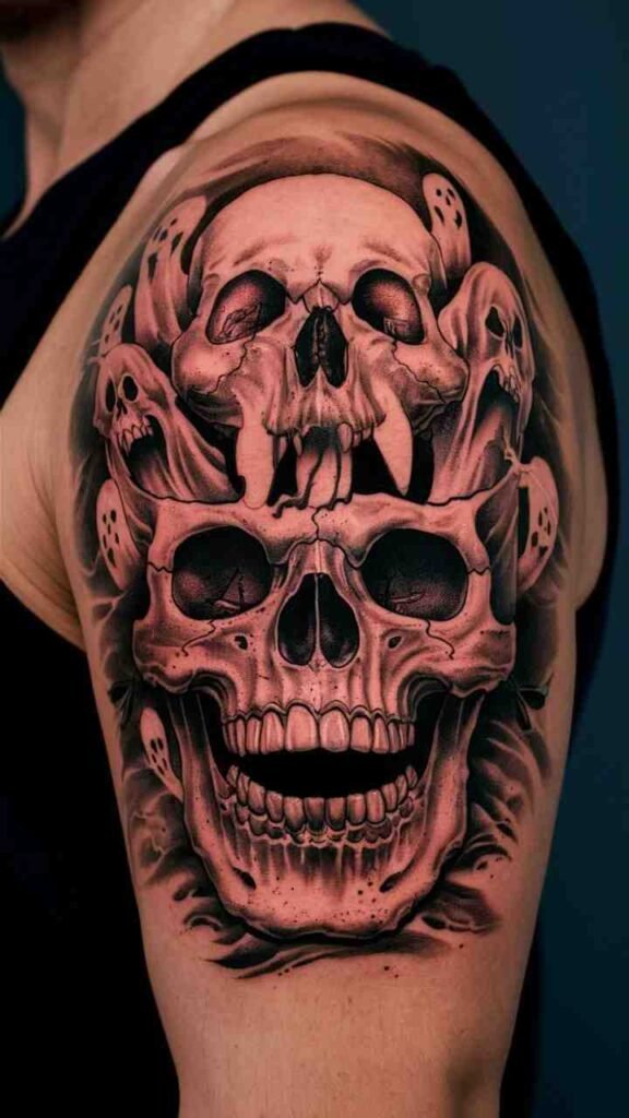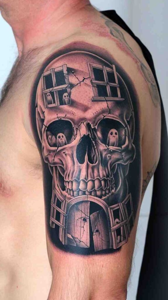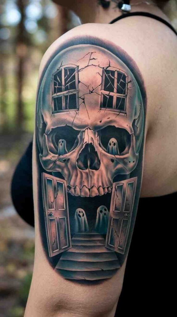 This tattoo combines a skull with a haunted house, carving windows and doors into the skull’s surface. It’s perfect for those who love Halloween’s creepy atmosphere. The design is detailed, with spooky elements like tiny ghosts and broken windows. It’s a creative and eerie choice, making it ideal for fans of haunted houses and skulls. A unique twist on a traditional design.