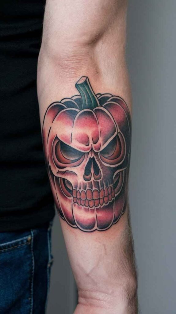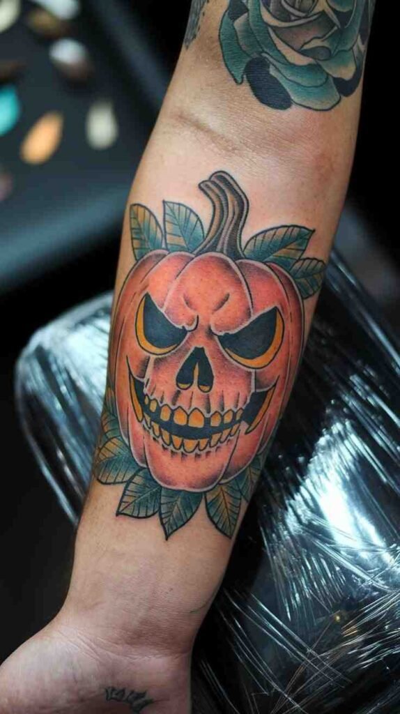 Pumpkin skull tattoo blends Halloween’s iconic symbols into one unique design. The skull is carved out like a jack-o’-lantern, giving it a spooky yet playful look. The design is bold and eye-catching, perfect for those who love Halloween’s festive spirit. The orange tones and sharp lines make it a striking choice. Ideal for anyone wanting a fun yet eerie tattoo.