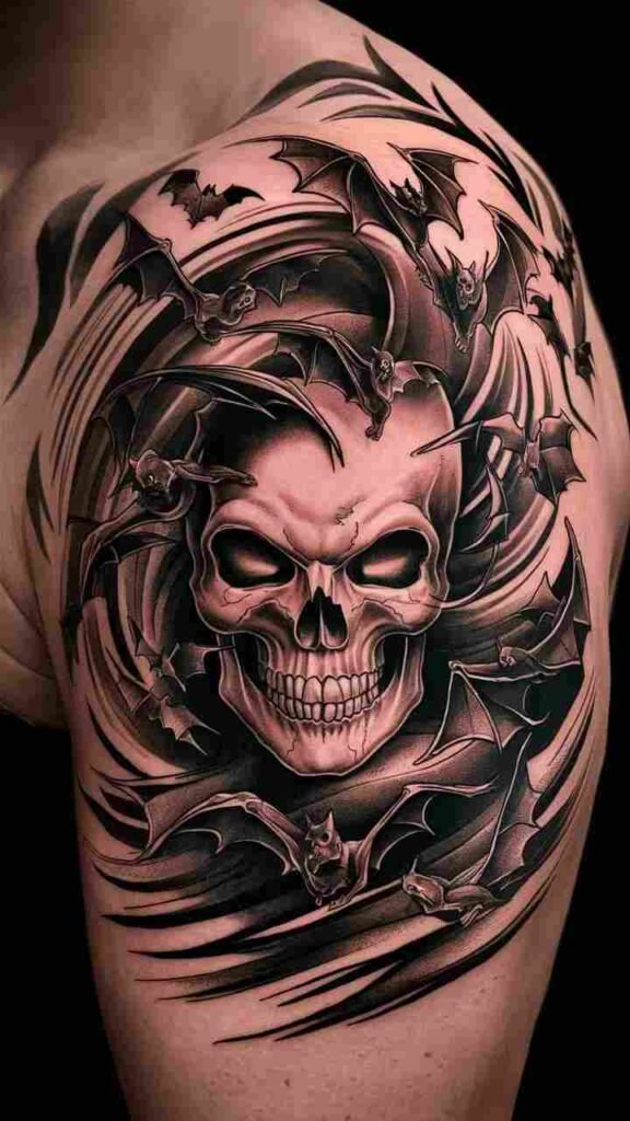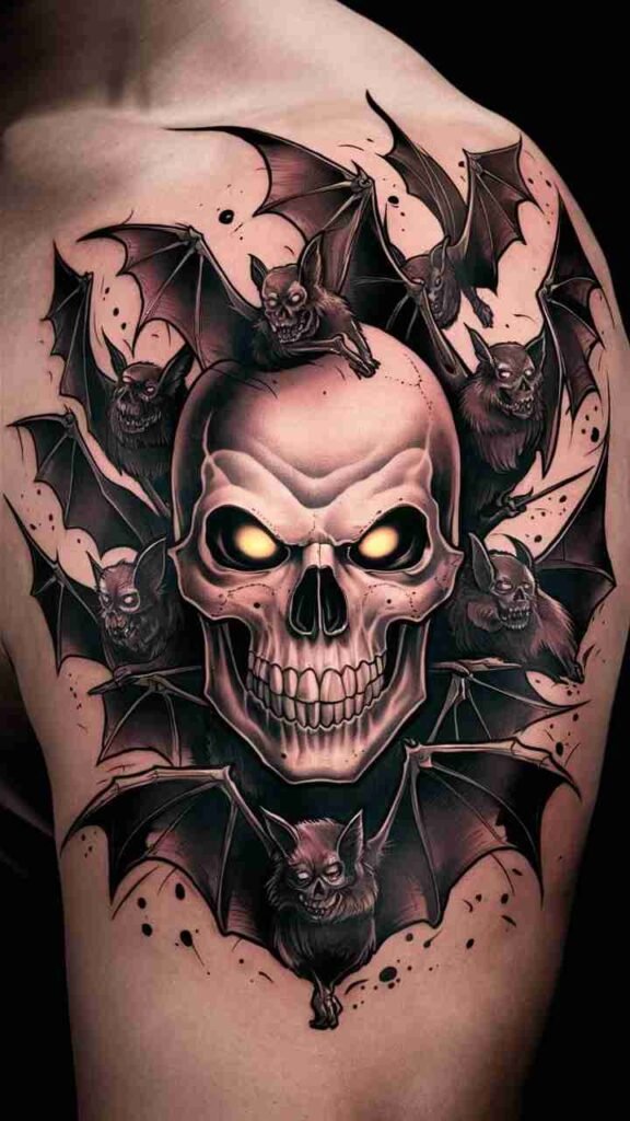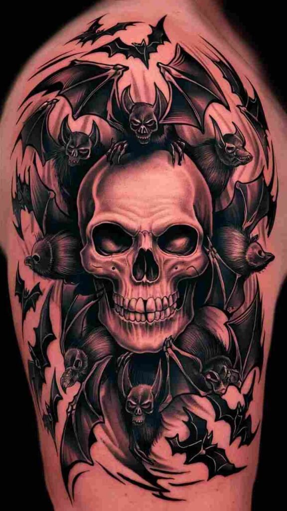 This tattoo features a skull surrounded by flying bats. It’s a perfect Halloween design, symbolizing the creatures of the night. The bats add movement and mystery, making the skull look even spookier. It’s a versatile design that works well on the arm, back, or chest. Ideal for those who want a dynamic, eerie tattoo that captures the essence of Halloween night.