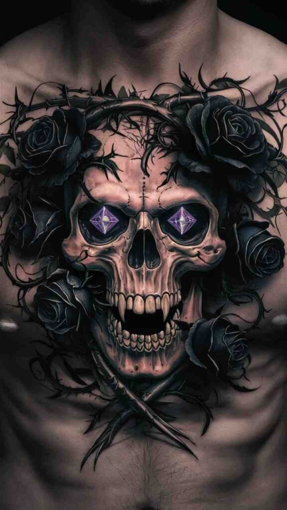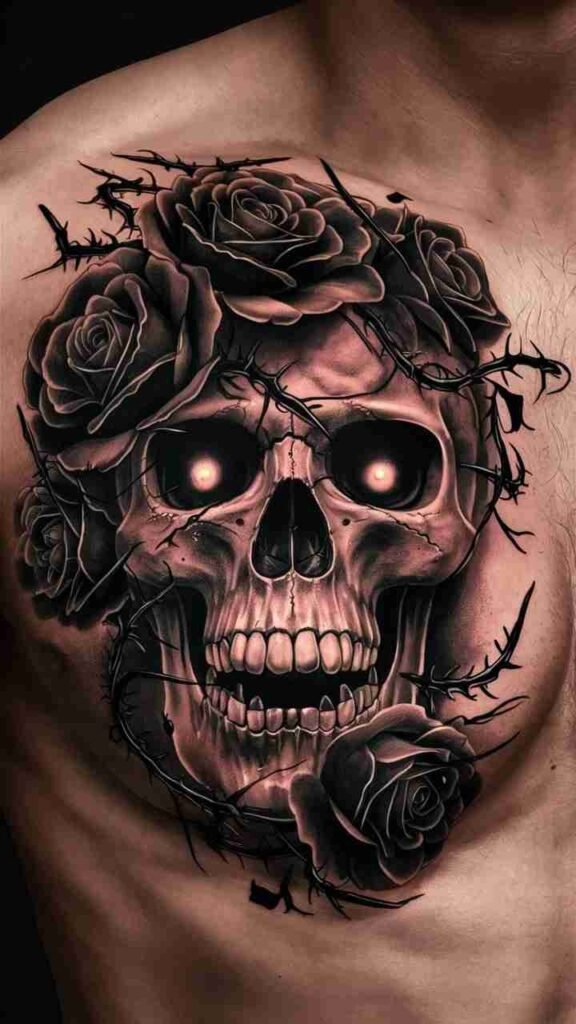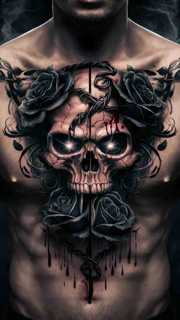 This tattoo features a skull intertwined with black roses, representing beauty and death. It’s a dark, elegant design, perfect for Halloween. The black roses add a touch of gothic romance to the skull. It’s ideal for those who want a tattoo that’s both beautiful and eerie. The design is intricate yet bold, making it a standout choice for anyone who loves dark, romantic themes.