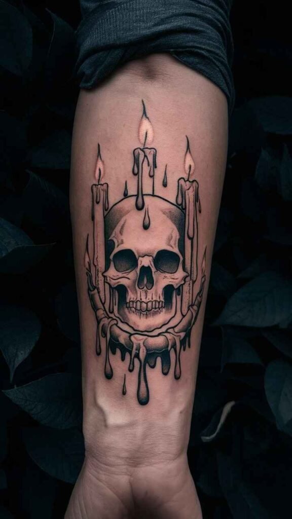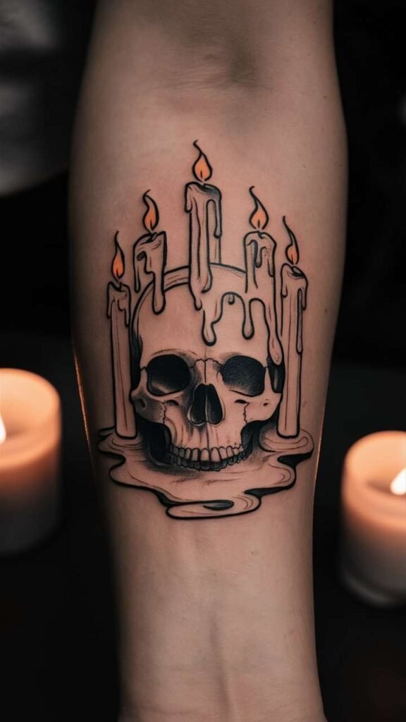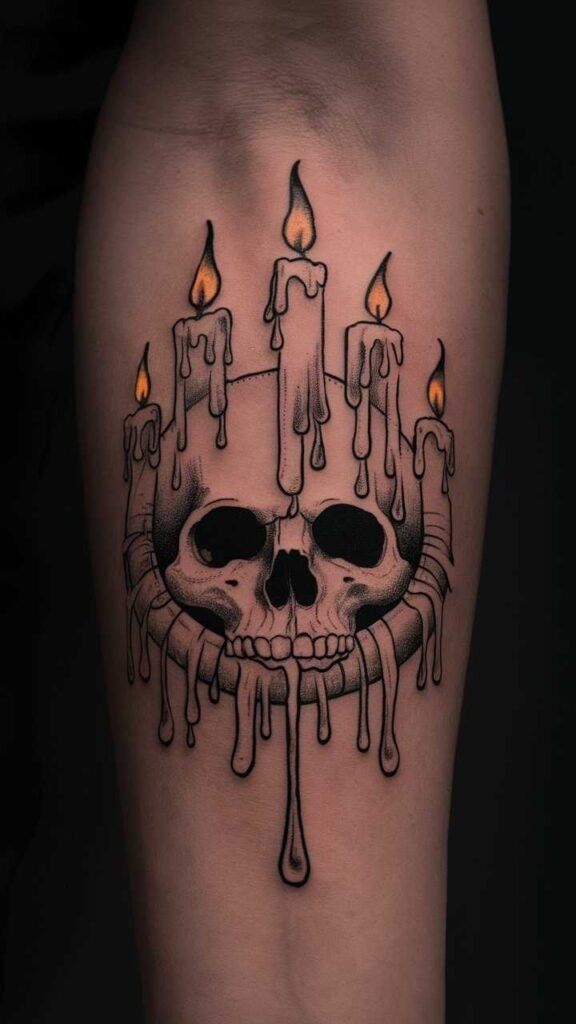 This tattoo features a skull surrounded by dripping candles, symbolizing light in the darkness. The design is mystical and haunting, perfect for Halloween. The candles add a warm glow, contrasting with the dark skull. It’s a great choice for those who want a tattoo with a deeper meaning. The combination of light and dark elements makes it both eerie and beautiful.