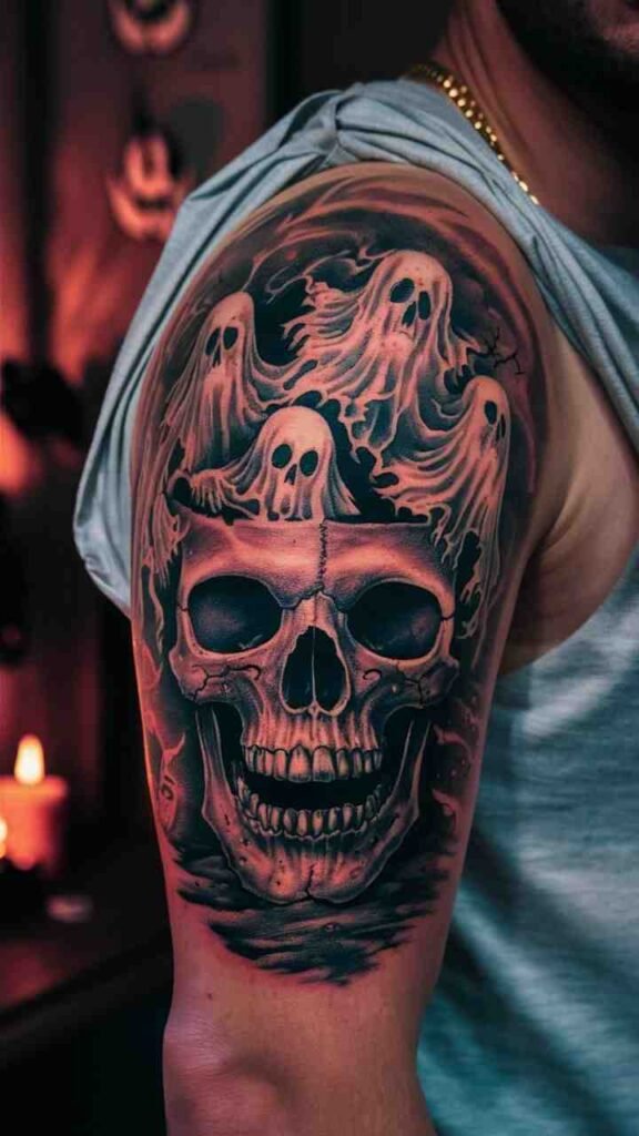 This tattoo shows a skull with ghostly figures emerging from it. It’s a haunting design, perfect for Halloween. The ghosts add an eerie presence, making the skull look even spookier. The design is both subtle and striking, with a soft, misty effect. Ideal for those who want a tattoo that’s both mysterious and haunting. A great choice for anyone who loves ghost stories and Halloween vibes.