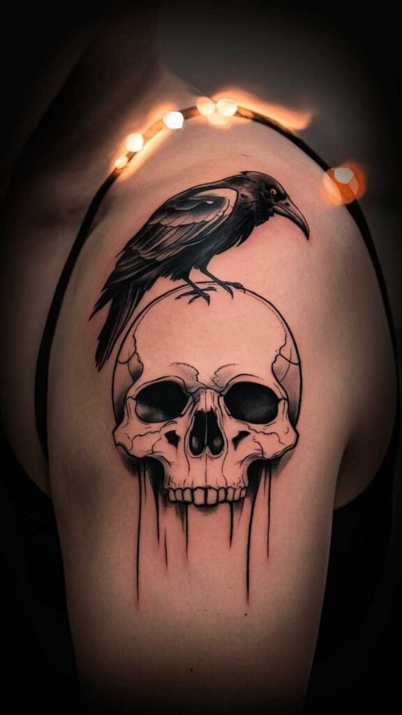 This tattoo shows a skull with a raven perched on top, symbolizing mystery and the supernatural. Inspired by Edgar Allan Poe’s “The Raven,” it’s perfect for fans of gothic literature. The raven adds a dark, ominous touch to the skull. It’s a great choice for those who love a classic, eerie design. The tattoo combines symbolism with Halloween vibes, making it both meaningful and spooky.
