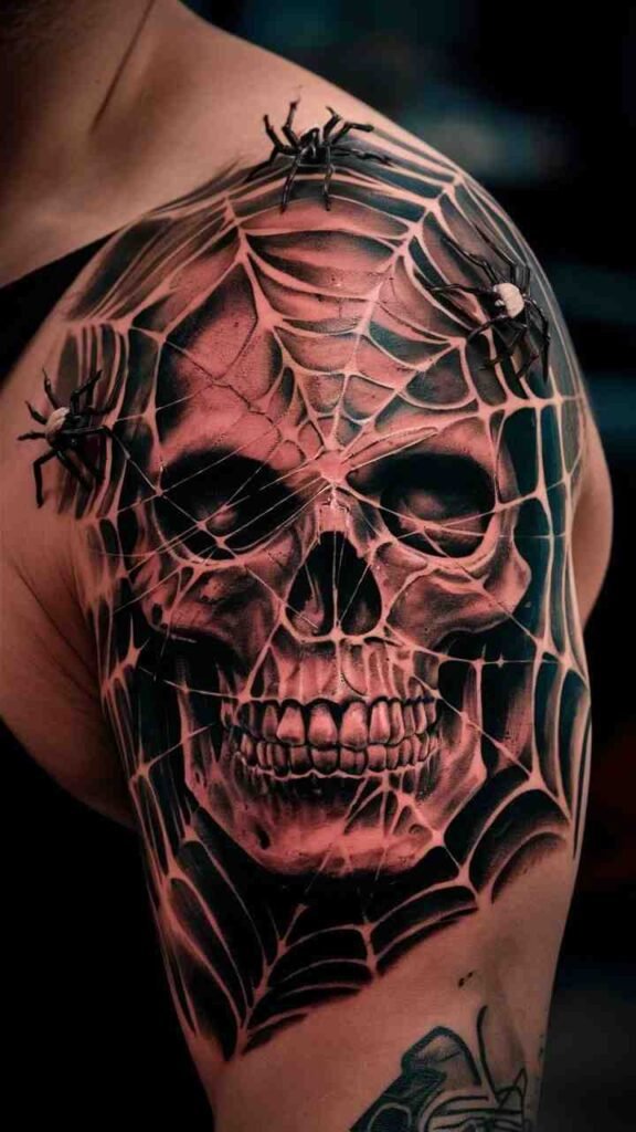 This tattoo features a skull wrapped in intricate spider webs, perfect for fans of creepy-crawlies. The design is detailed, with fine lines and shadows creating a realistic effect. It’s an ideal choice for Halloween, combining classic spooky elements. The webs add a sense of entrapment, making the skull look even more eerie. Great for those who want a detailed and haunting tattoo.