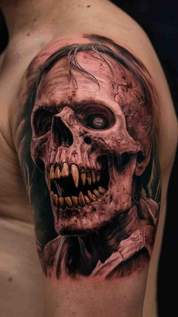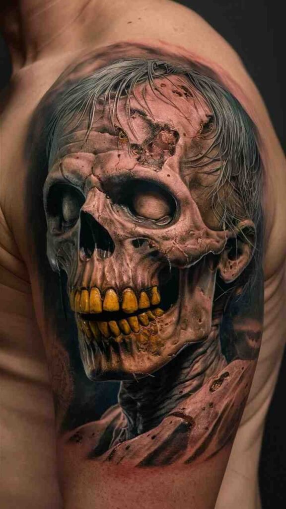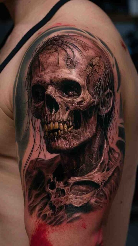 The zombie skull tattoo shows a decaying skull with exposed teeth and rotting flesh. It’s the perfect embodiment of undead horror for Halloween. The design is gruesome and realistic, with earthy tones adding to the decayed look. It’s ideal for horror fans who want a bold, unsettling tattoo. The zombie theme makes it a standout choice for anyone who loves the darker side of Halloween.