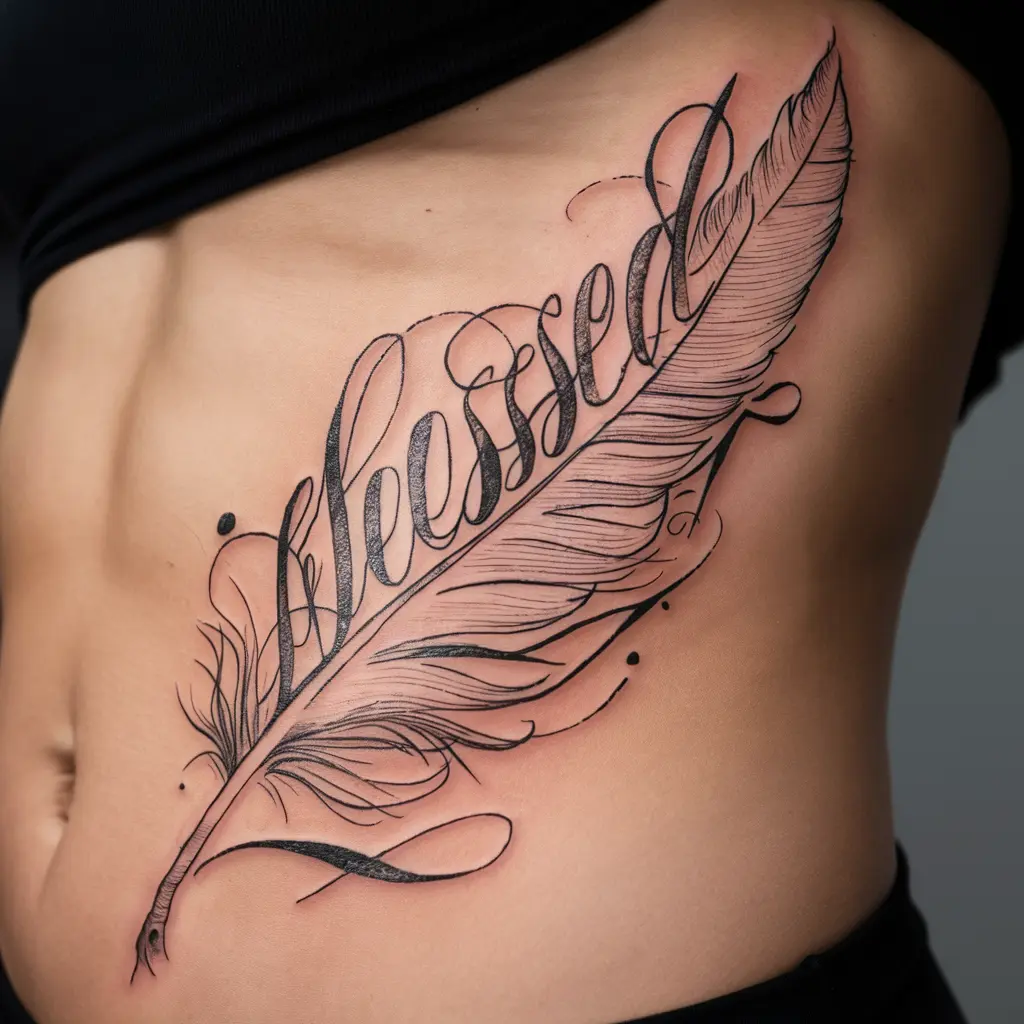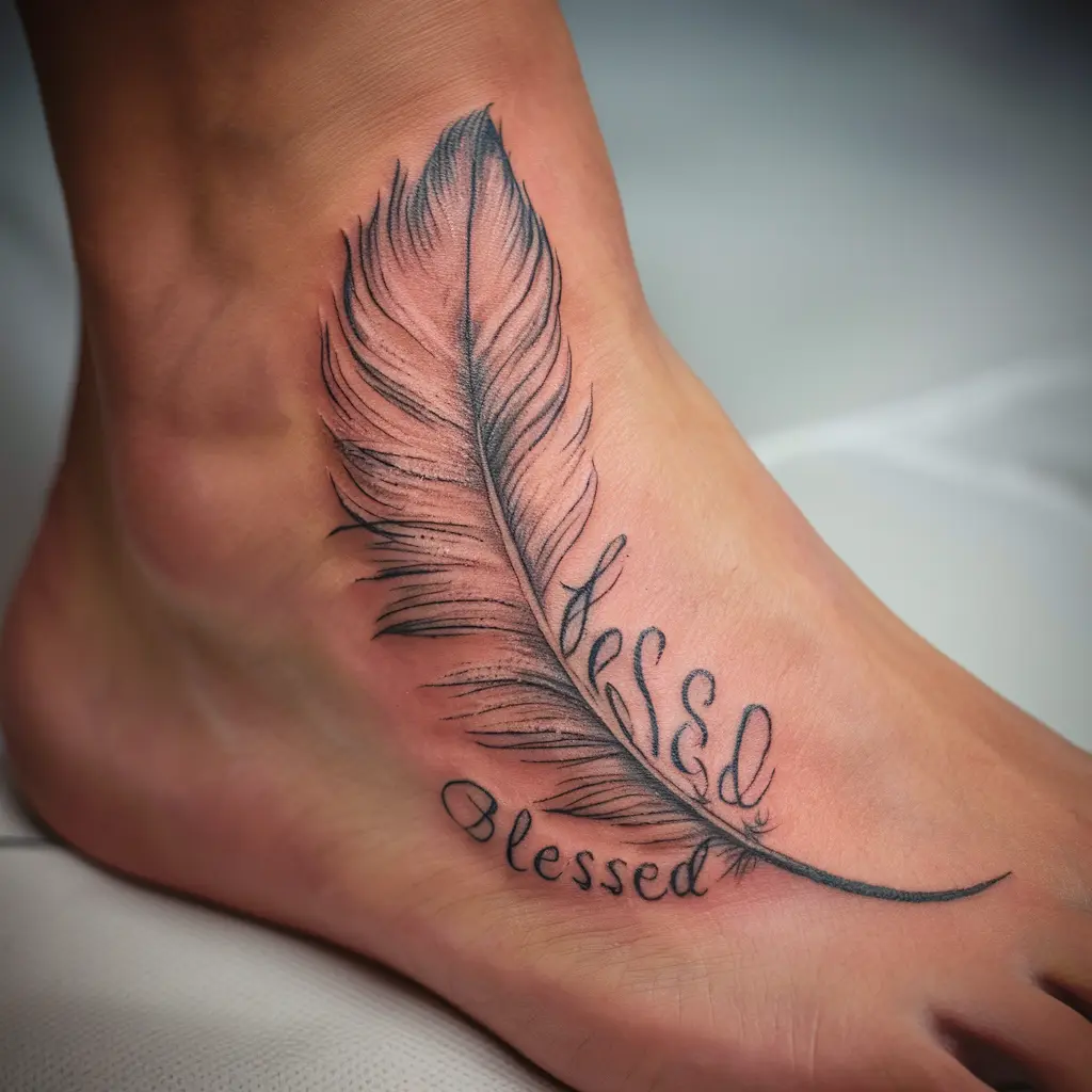 A feather represents lightness, freedom, and spirituality. Combine it with “Blessed,” and it’s a tattoo full of hope.