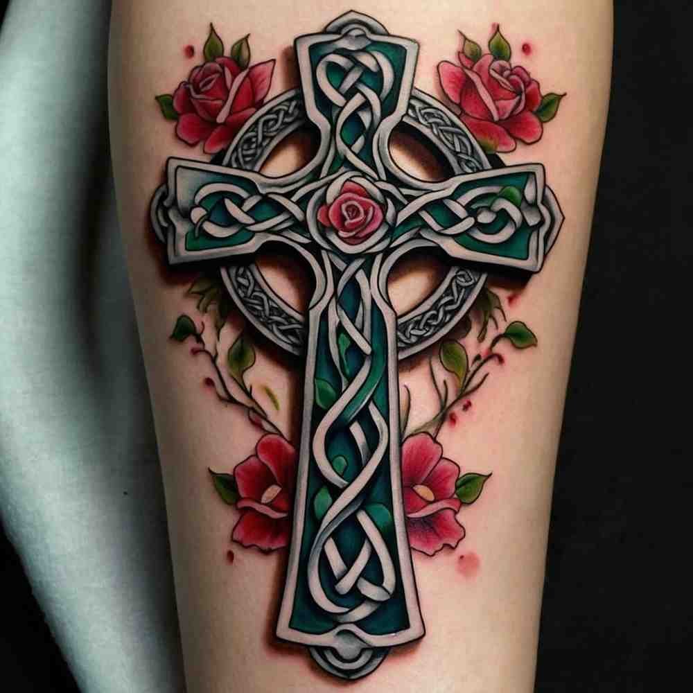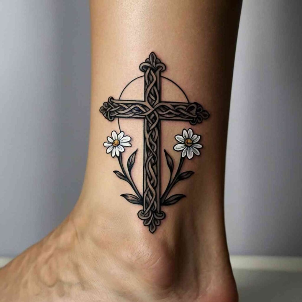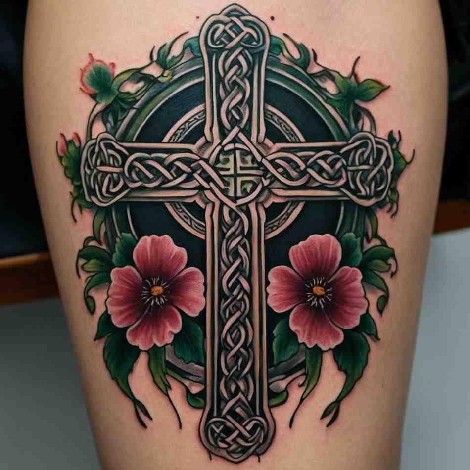 A Celtic cross surrounded by delicate flowers combines ancient spirituality with modern femininity. The intricate design of the Celtic cross is often associated with eternity and faith, making it a meaningful option for those connected to their heritage.