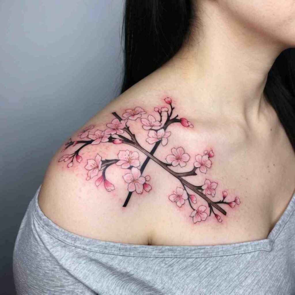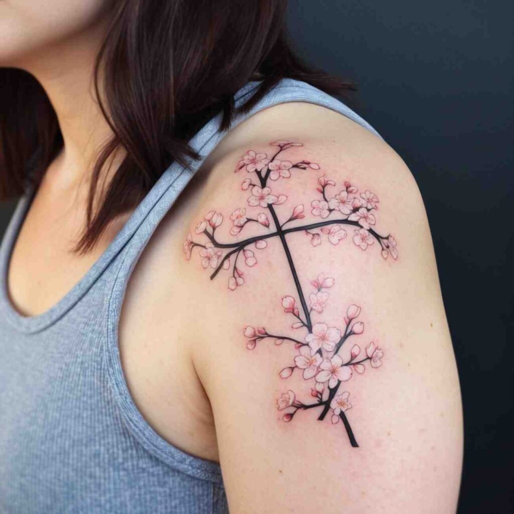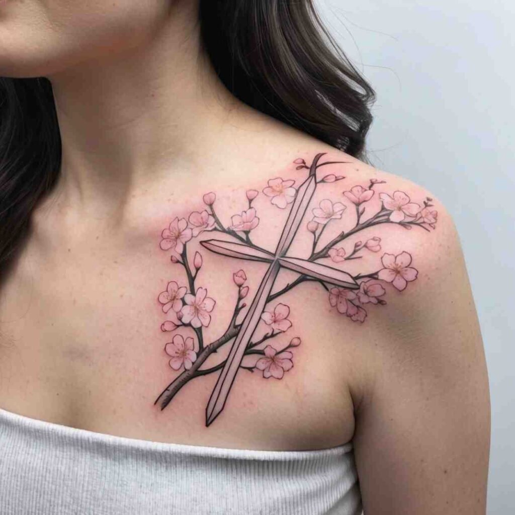 A cross intertwined with cherry blossoms symbolizes the beauty of life and the delicate balance of existence. Cherry blossoms represent renewal and the fleeting nature of life, making this a meaningful tattoo for someone who appreciates living in the moment.