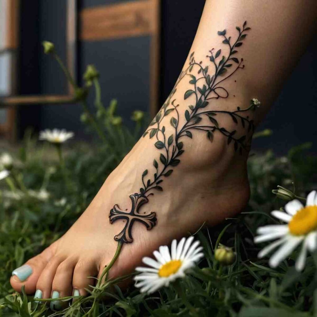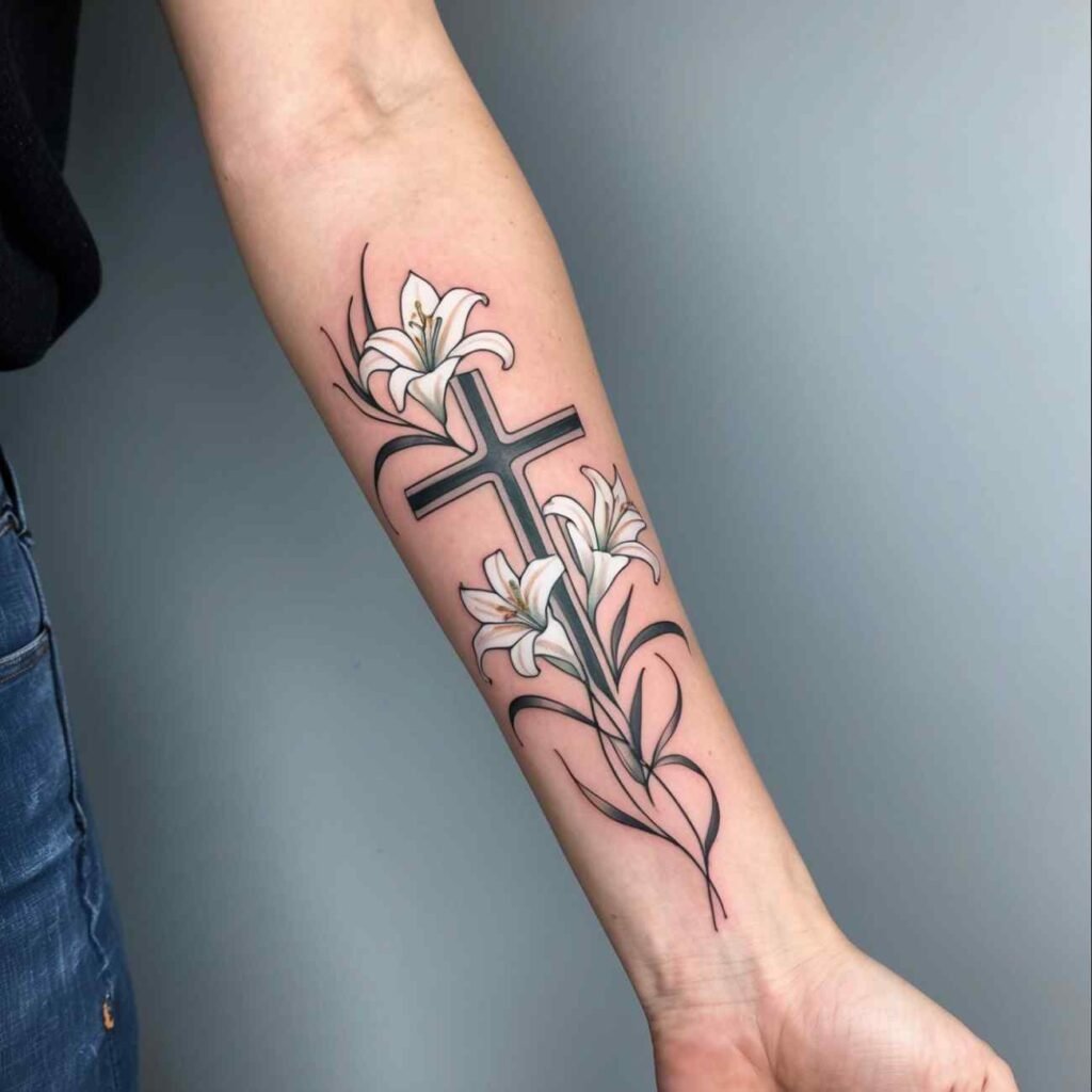 Lilies are often associated with purity and devotion. Combined with a cross, this tattoo design reflects a deep spiritual connection, purity of faith, and feminine grace. It’s an elegant and simple choice for those who want a timeless design.