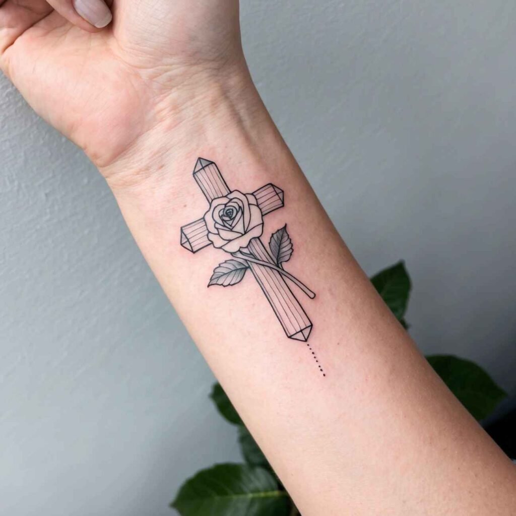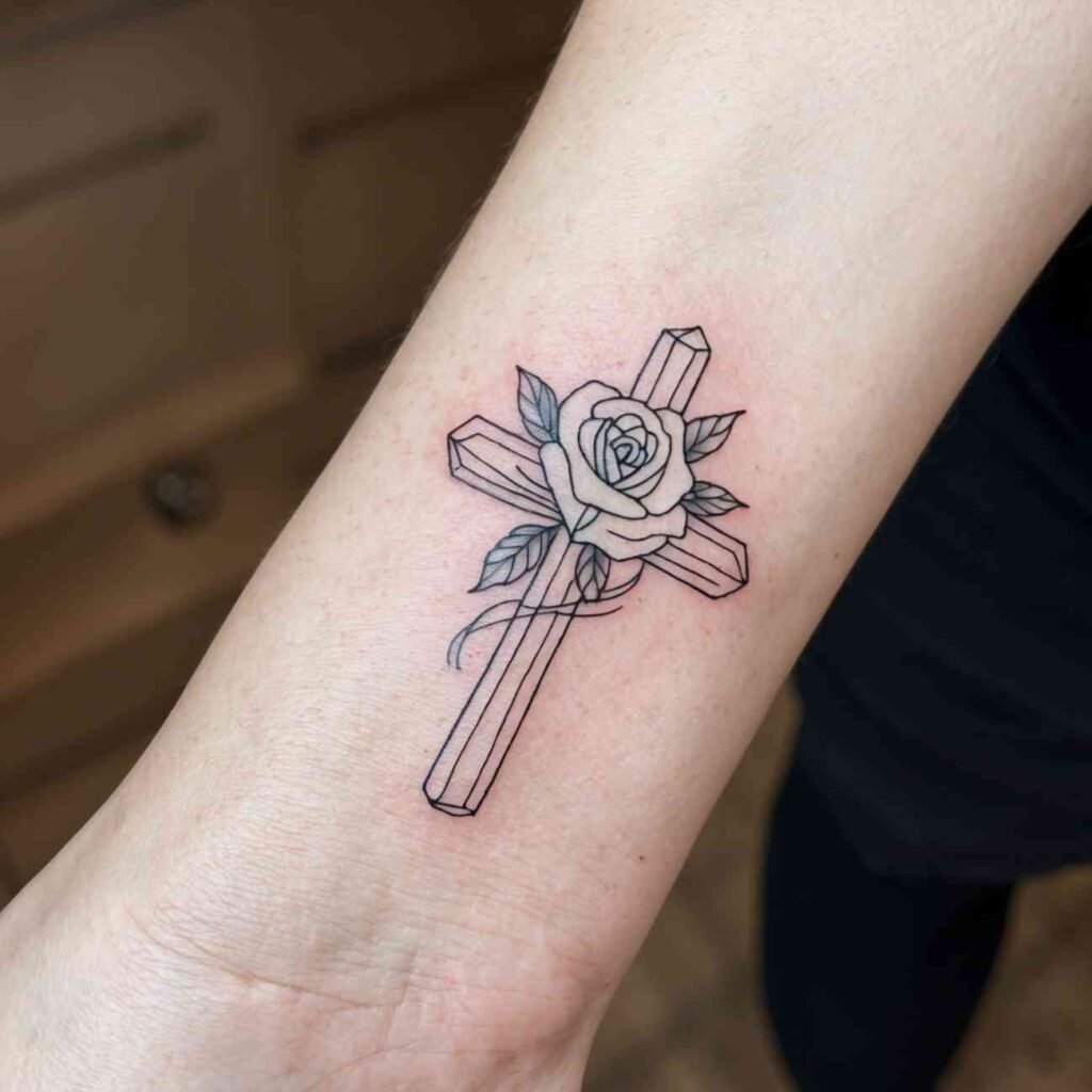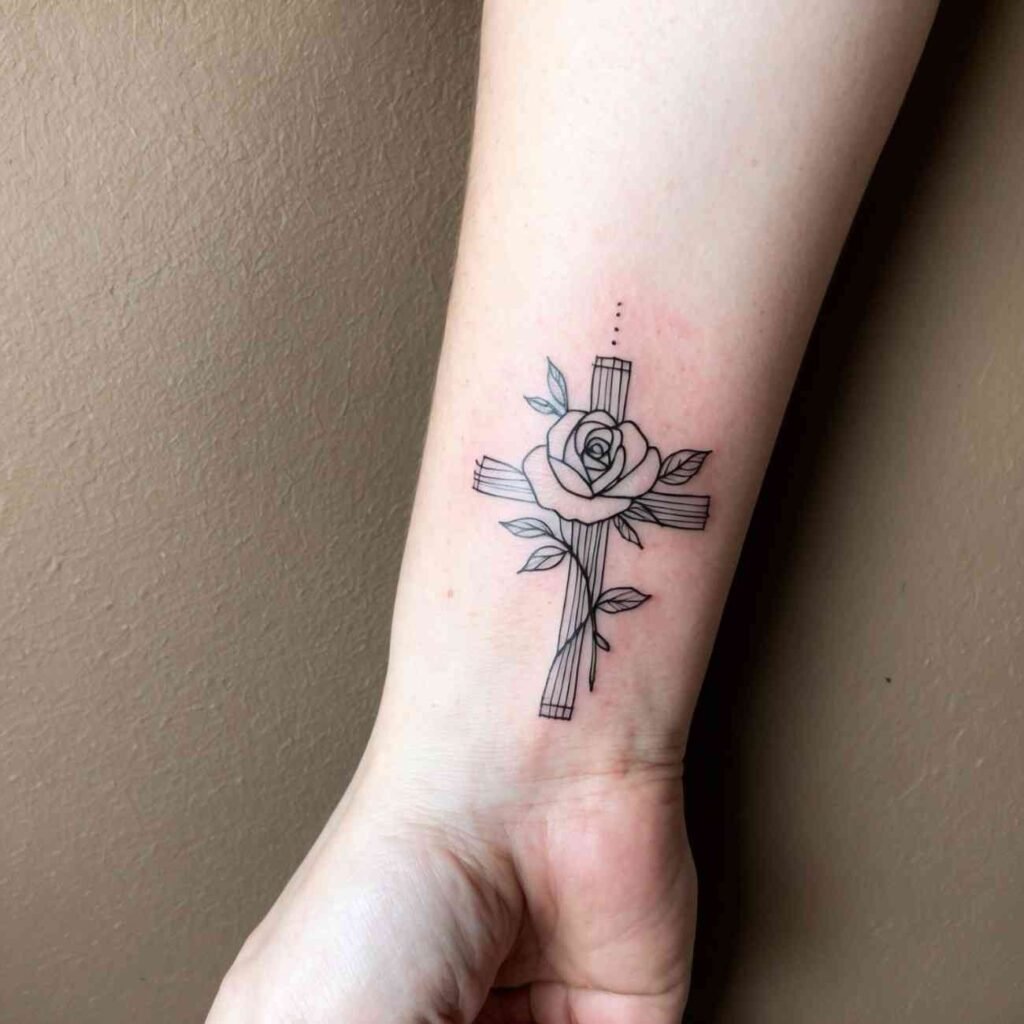 This simple design pairs a small cross with a single rose wrapped around it. The rose symbolizes love and beauty, while the cross stands for faith. This tattoo is perfect for someone who values simplicity but wants something with deep meaning.