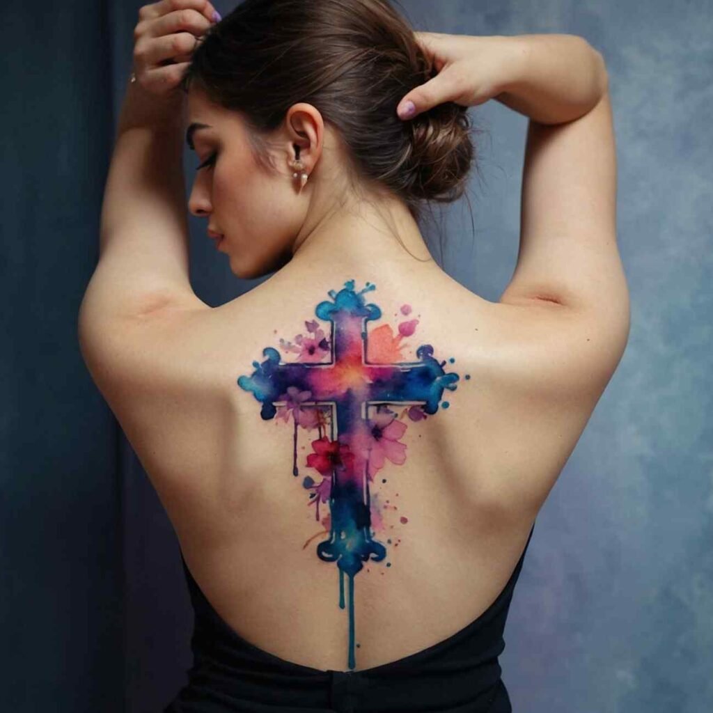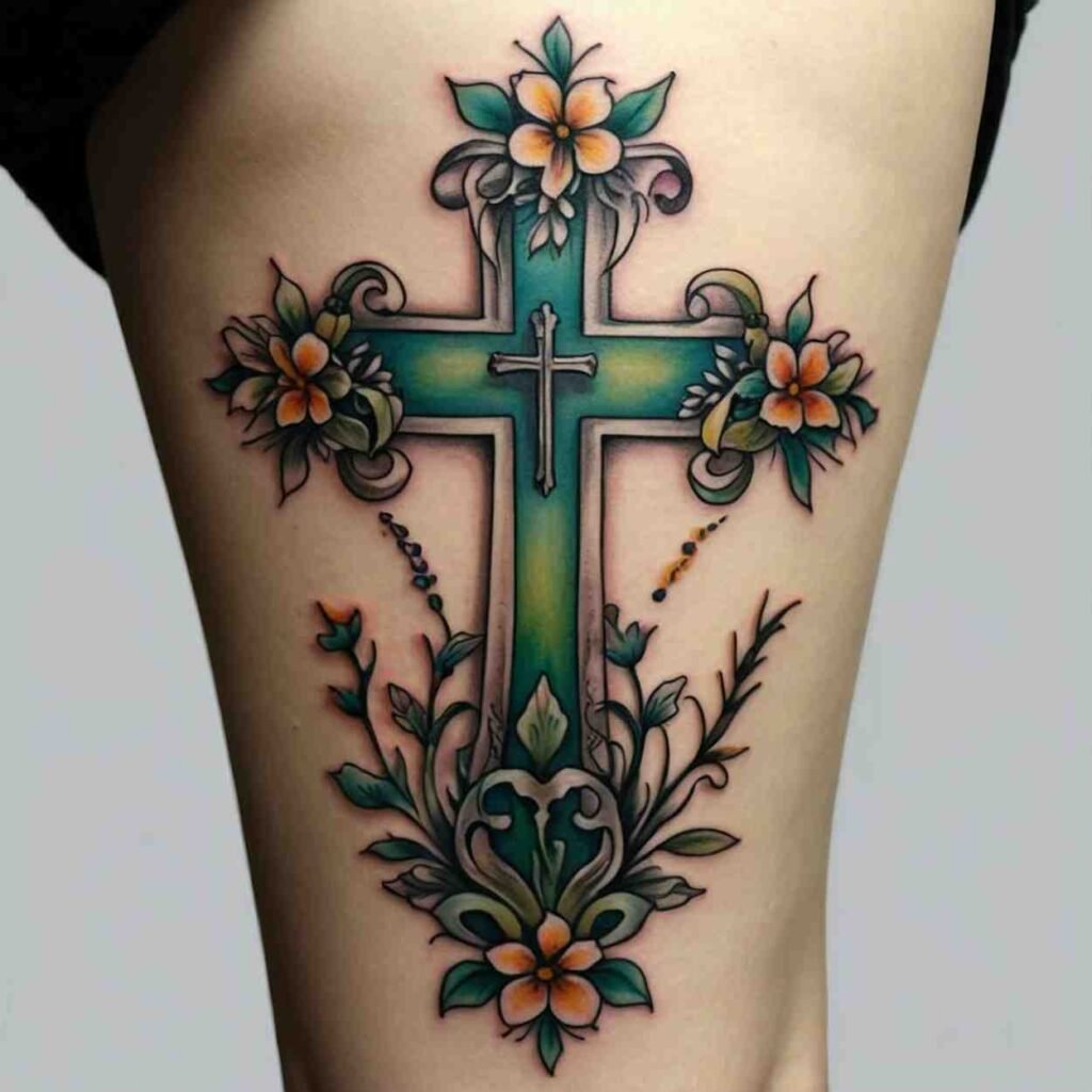 For a more artistic touch, a watercolor style can be used to create a soft, flowing floral cross tattoo. This design gives a dreamy, painterly effect that symbolizes the beauty of faith blending with creativity and life’s delicate moments.