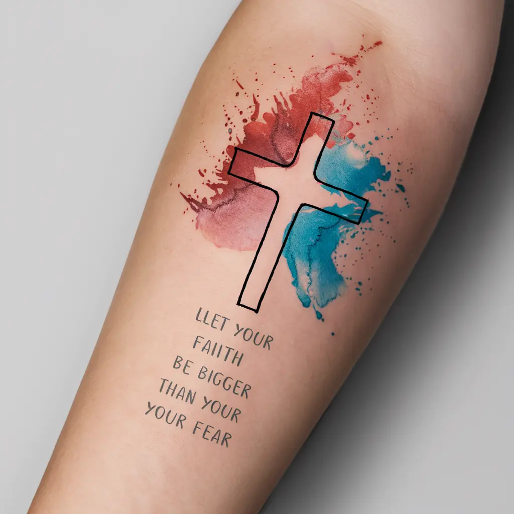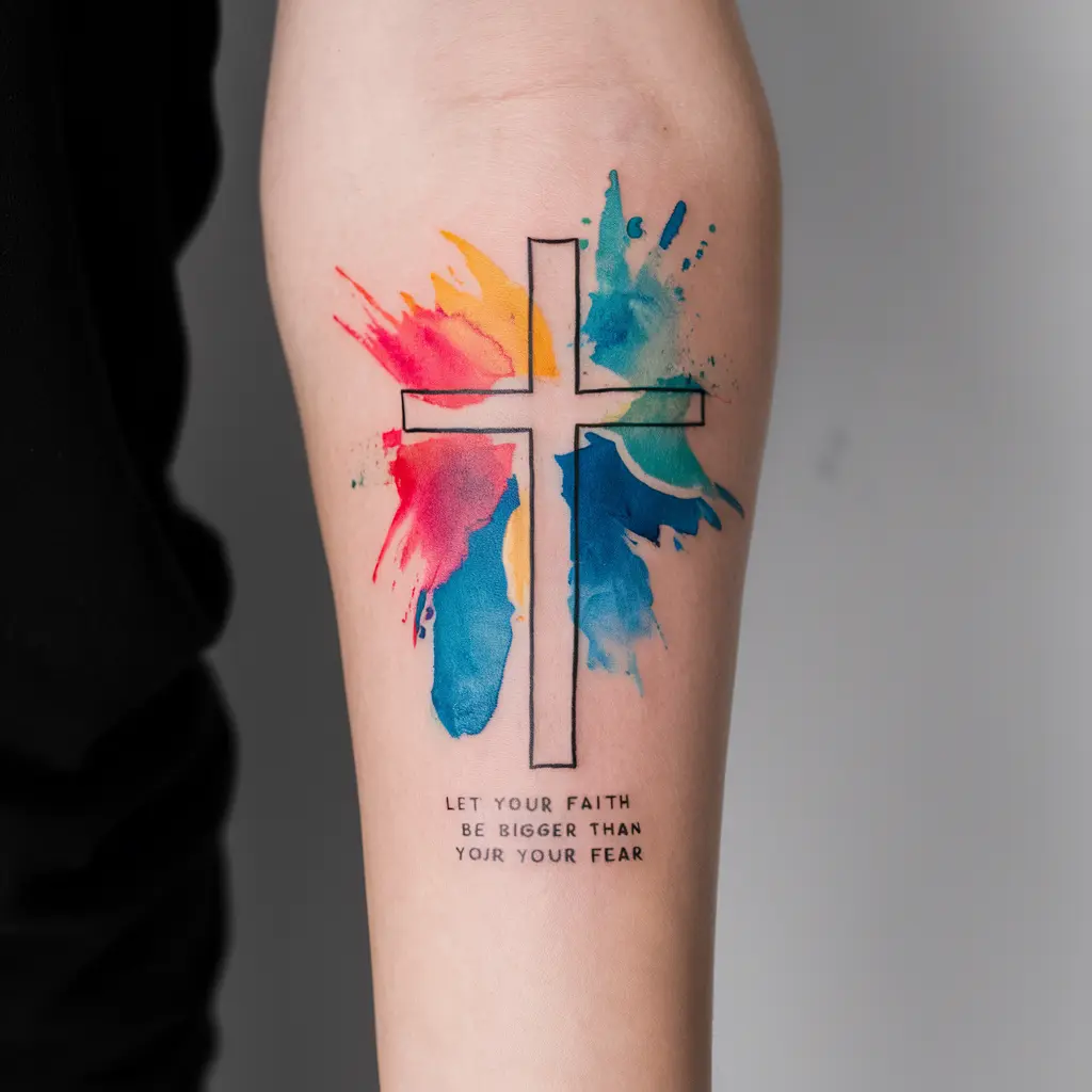 Tattoo Meaning: The cross is a timeless symbol of faith, and the watercolor represents the emotions and power of the message.