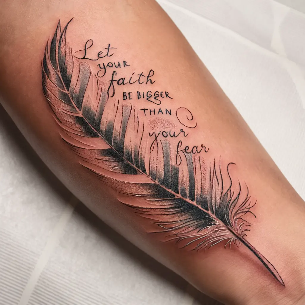 A simple feather with the phrase “Let your faith be bigger than your fear” flowing through its delicate quill and ends.
