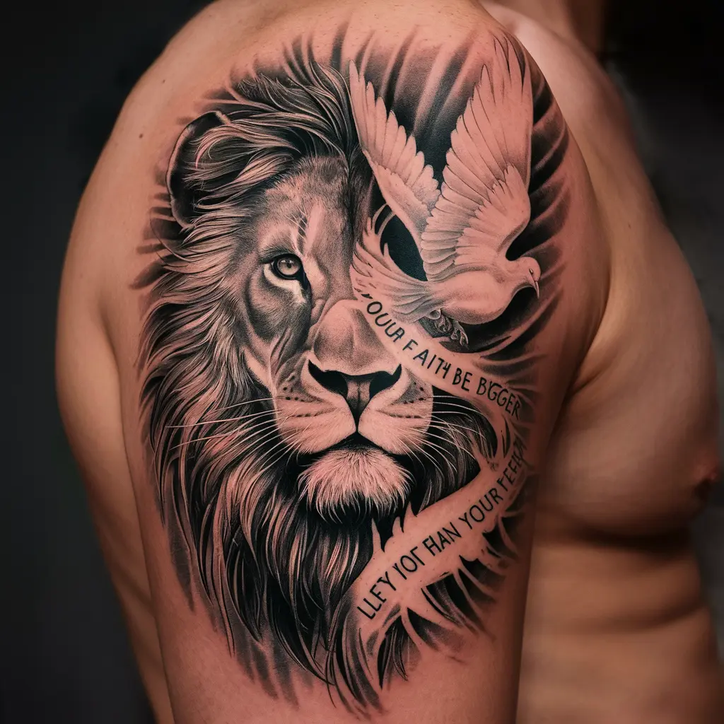 Tattoo Meaning: The lion represents the strength that faith gives you, and the dove shows how faith brings peace into your life, even in the face of fear.