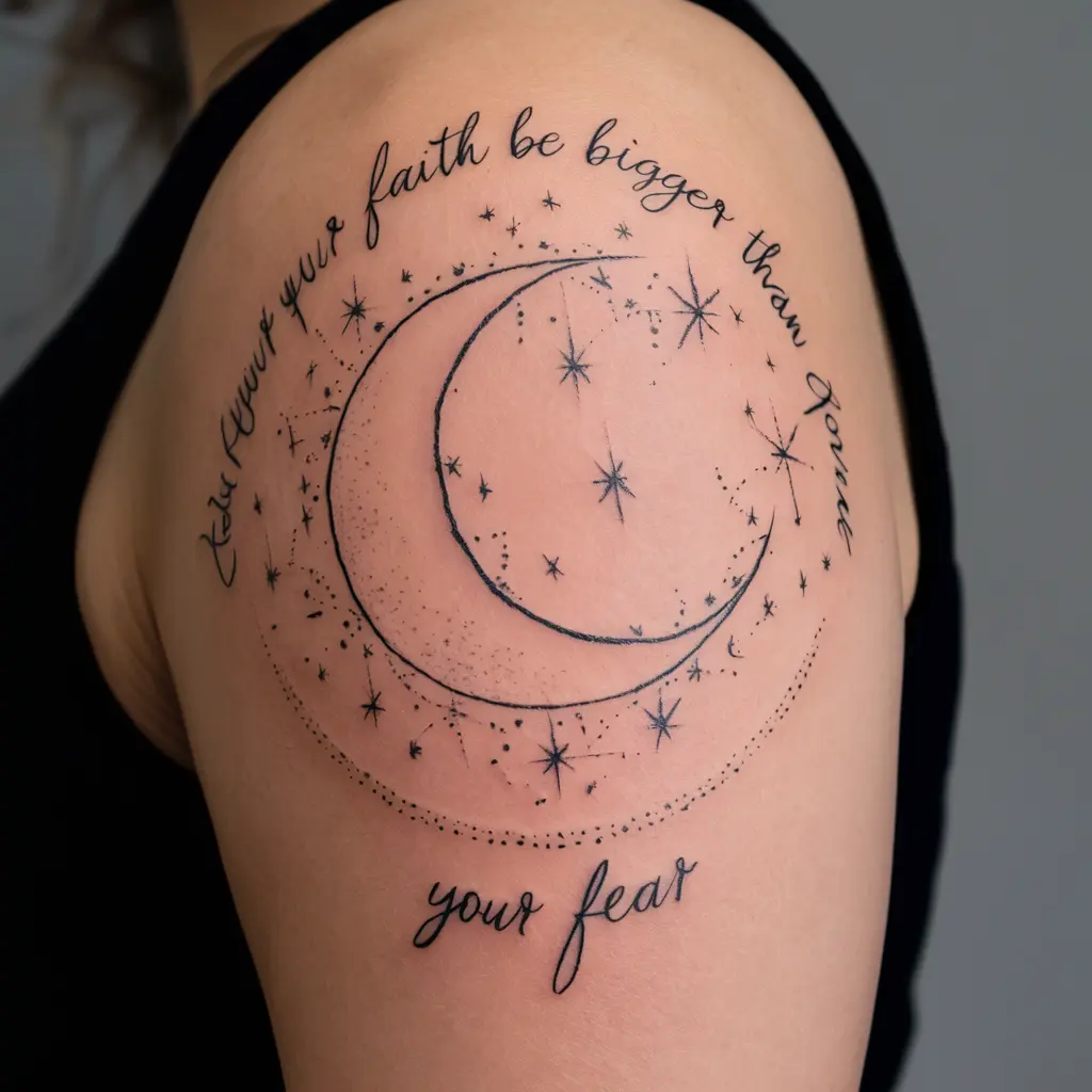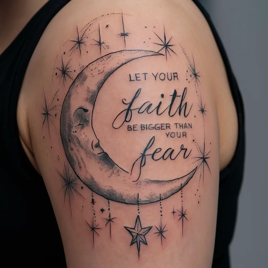 Tattoo Meaning: The moon represents calmness and faith shining in the darkness, while the stars show the light that fear cannot dim.