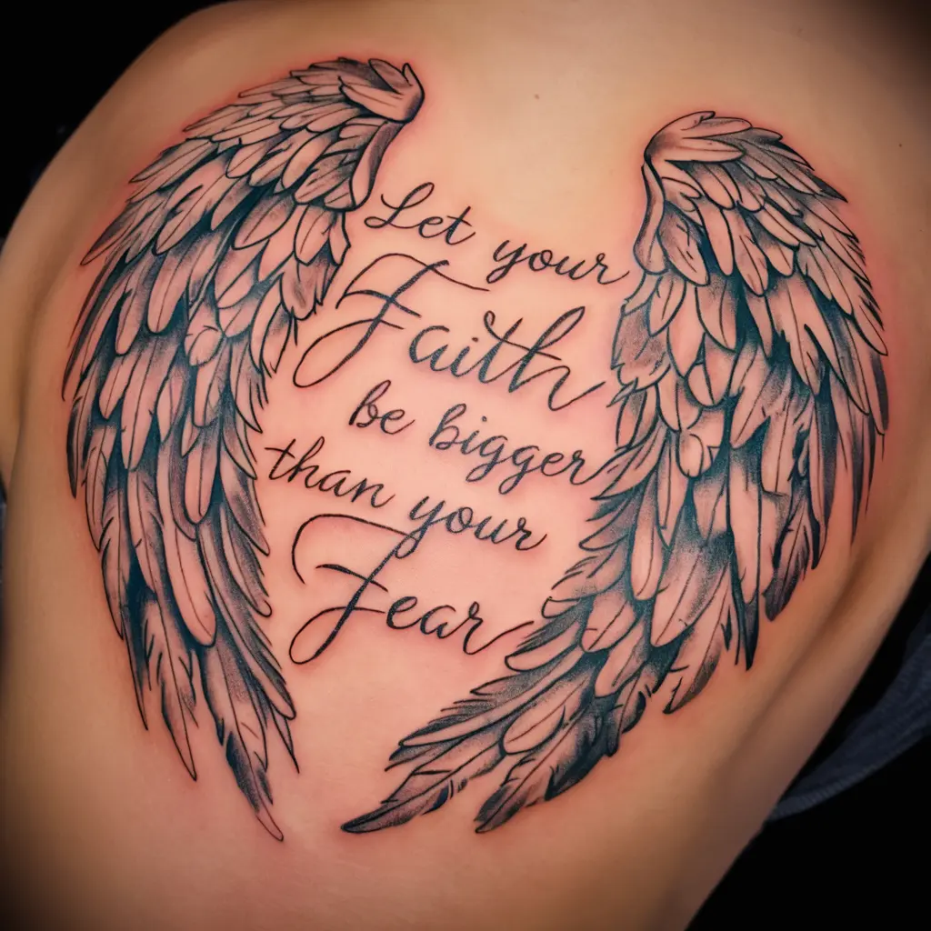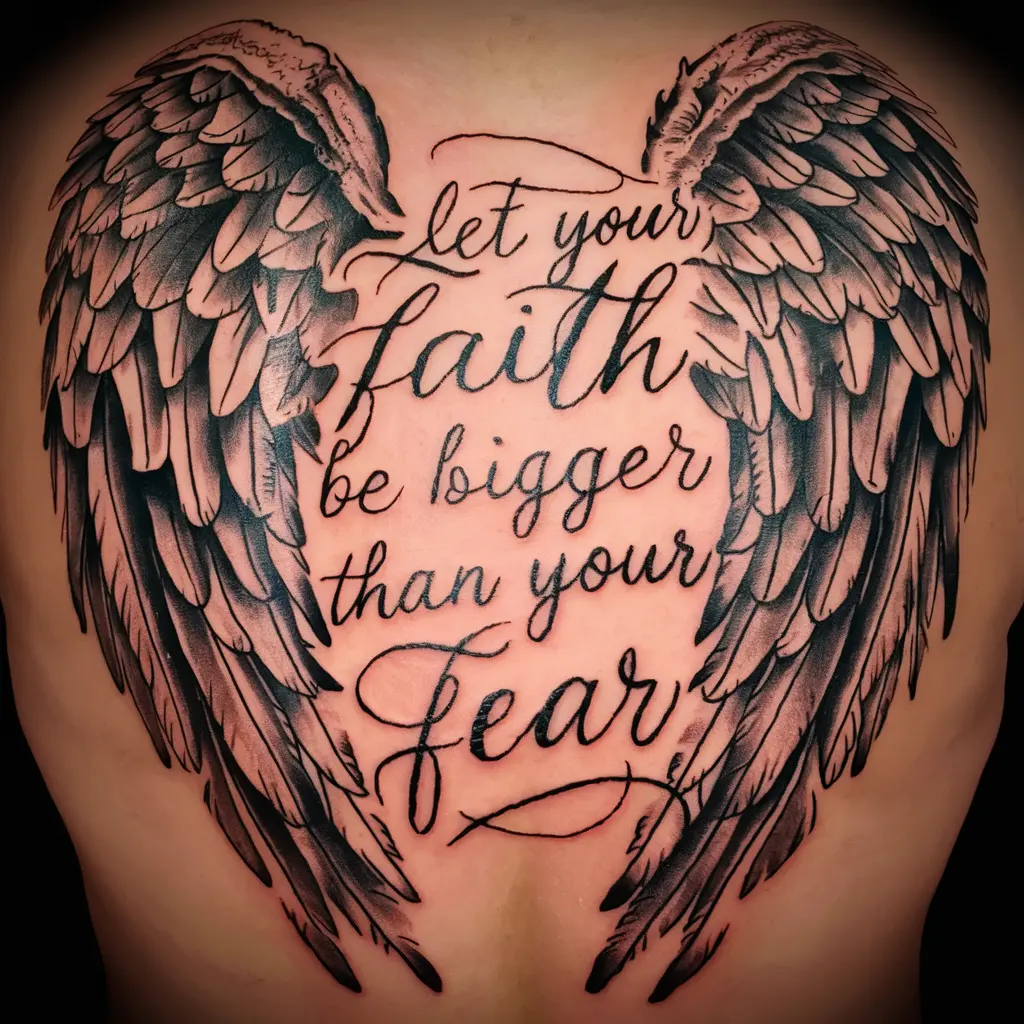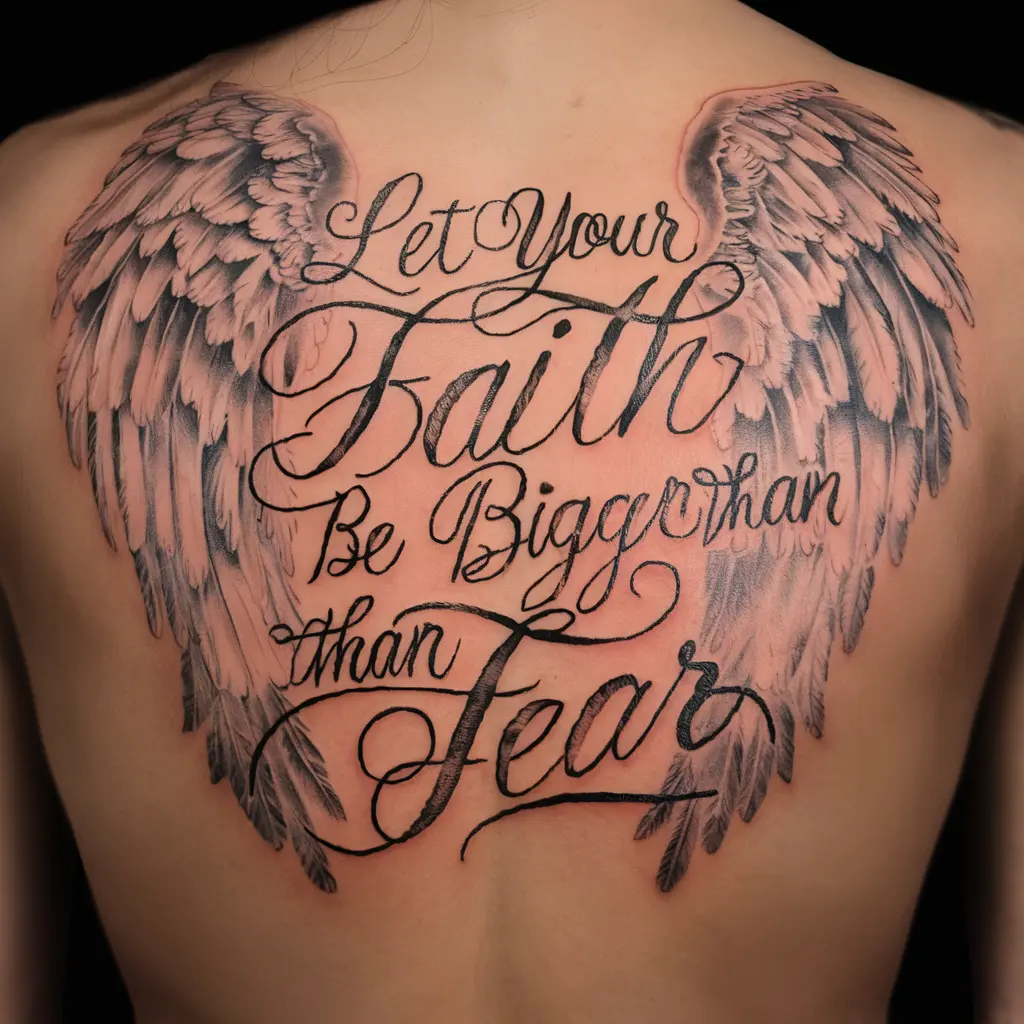 A stunning idea is to have the quote “Let your faith be bigger than your fear” in beautiful cursive script, framed by delicate angel wings.