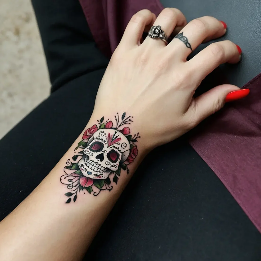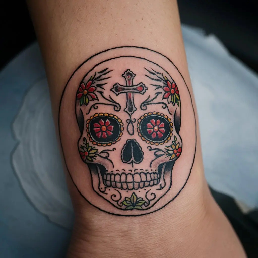 Adding a small cross to a sugar skull tattoo can enhance its religious meaning, symbolizing faith, protection, and spirituality. This design works well in smaller sizes, making it ideal for wrist or neck placement.