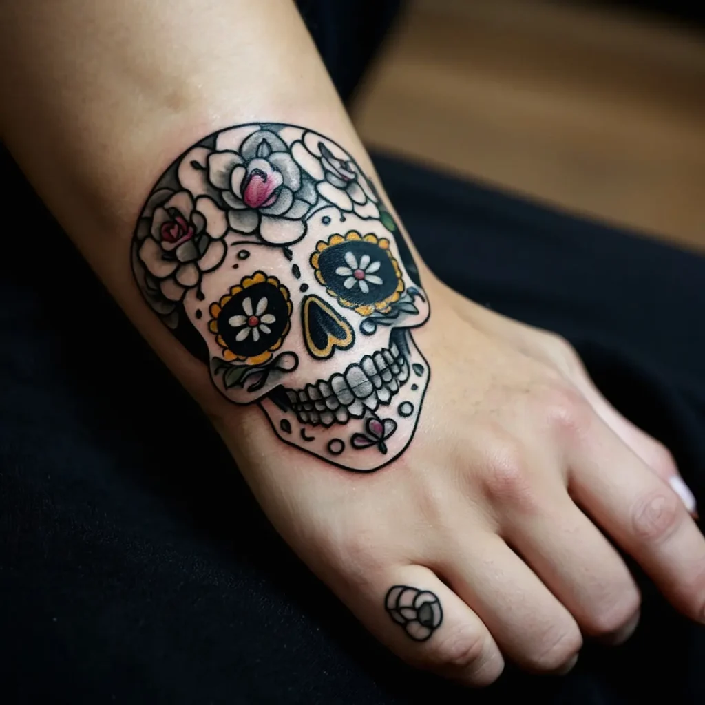 While many people opt for large and colorful sugar skull tattoos, small sugar skull tattoos are perfect for those seeking something subtle yet meaningful. They can be easily placed on wrists, ankles, or behind the ear, and still carry the same deep significance.