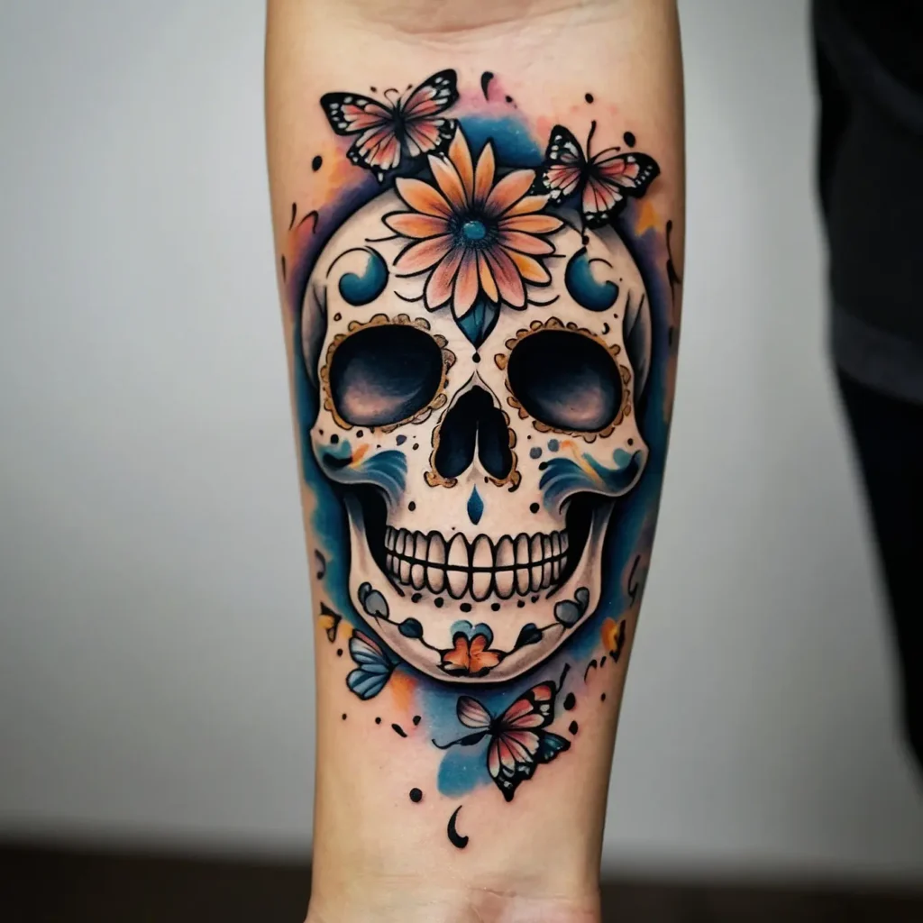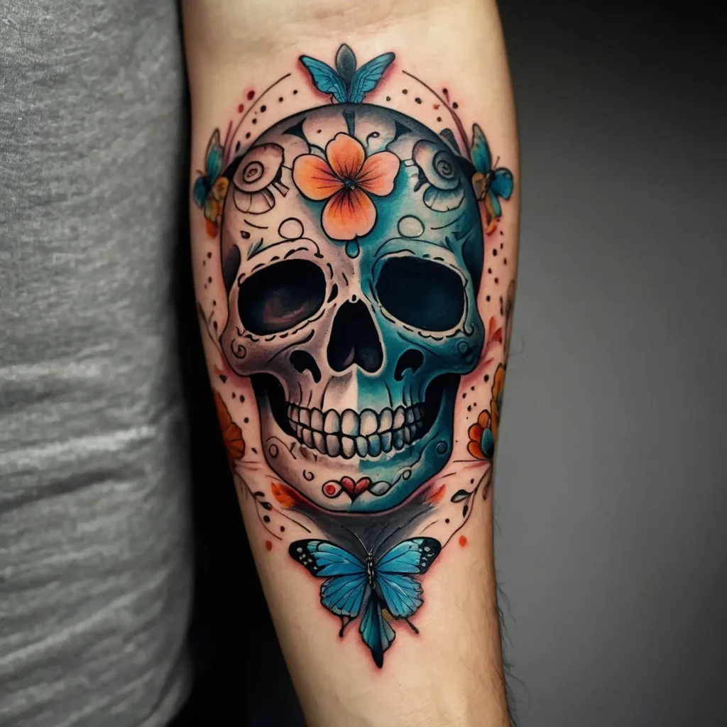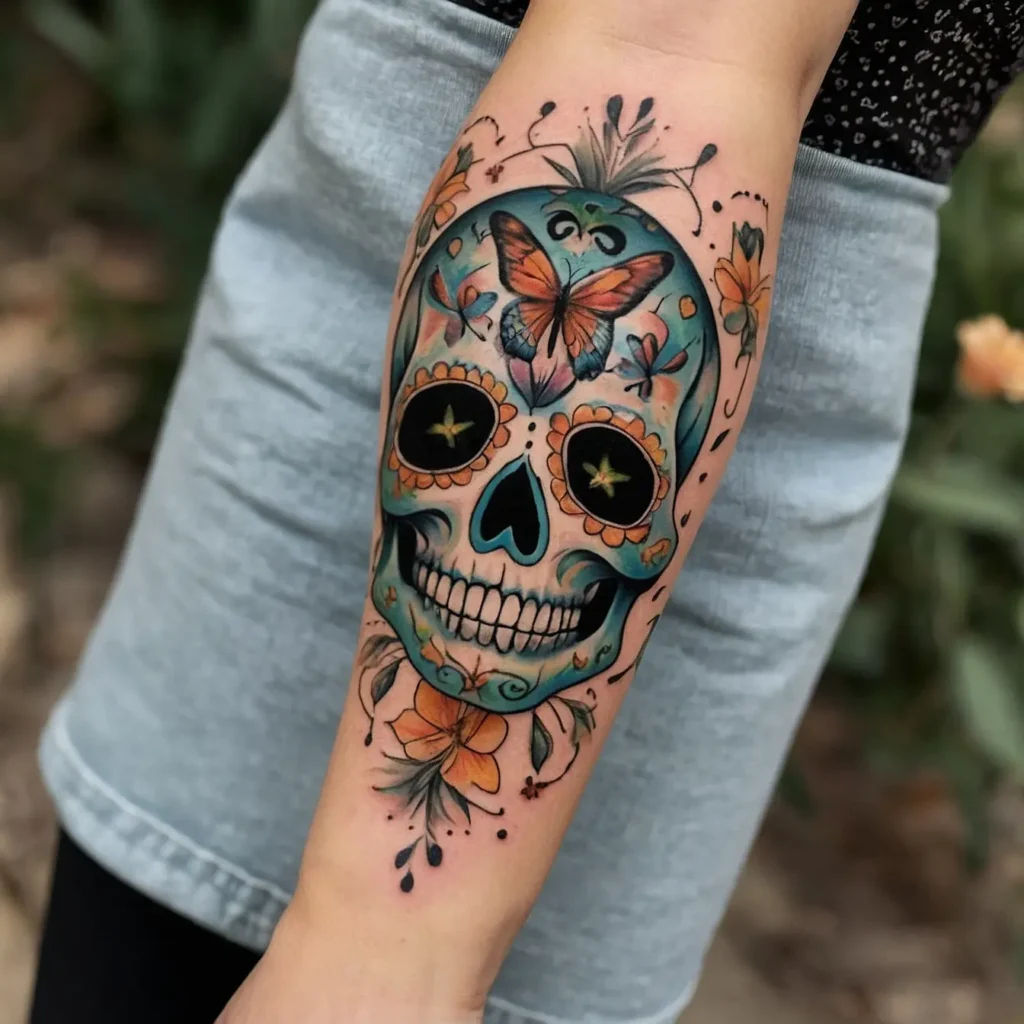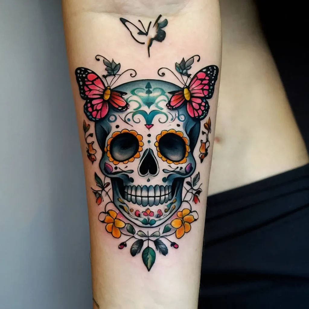 Butterflies are often seen as symbols of transformation and resurrection. A small sugar skull tattoo paired with butterflies represents the cycle of life, rebirth, and the connection between the physical and spiritual world. This design is perfect for placement on the shoulder or forearm.