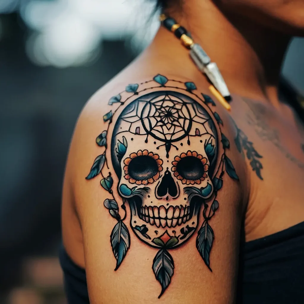 Dreamcatchers are associated with protection and capturing good dreams. A small sugar skull tattoo combined with a dreamcatcher can signify protection for the soul or a desire to keep positive memories alive. This design works well for placement on the shoulder or lower back.