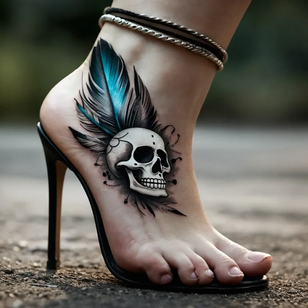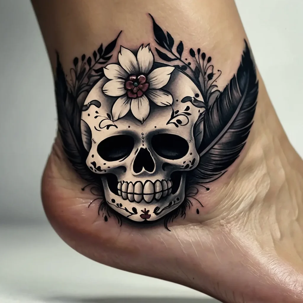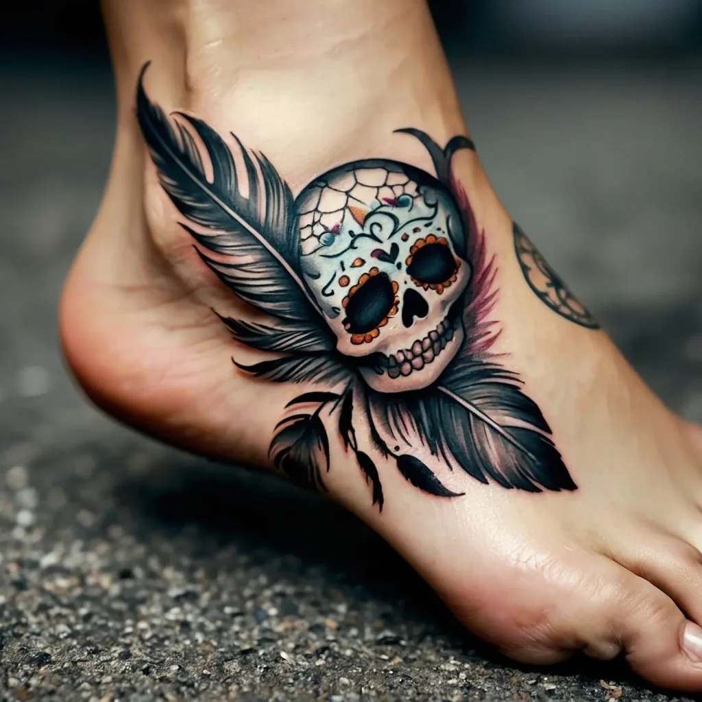 Feathers are symbols of freedom and connection to the spiritual world. When paired with a small sugar skull tattoo, feathers can signify the soul’s journey or freedom from earthly bonds. This design works well for a tattoo on the ankle or arm.