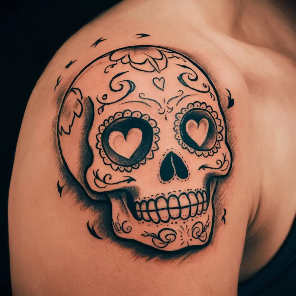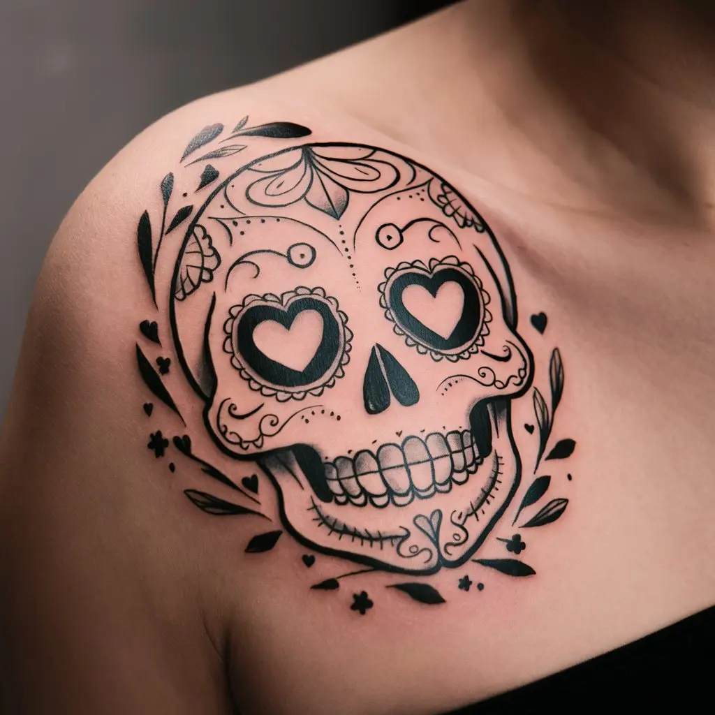 This playful take on the sugar skull incorporates heart-shaped eye sockets, symbolizing love and passion. It’s a perfect choice for those who want to express affection for lost loved ones or celebrate the eternal bond of love beyond death.