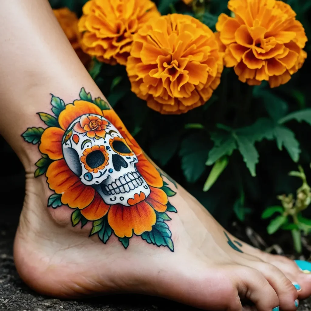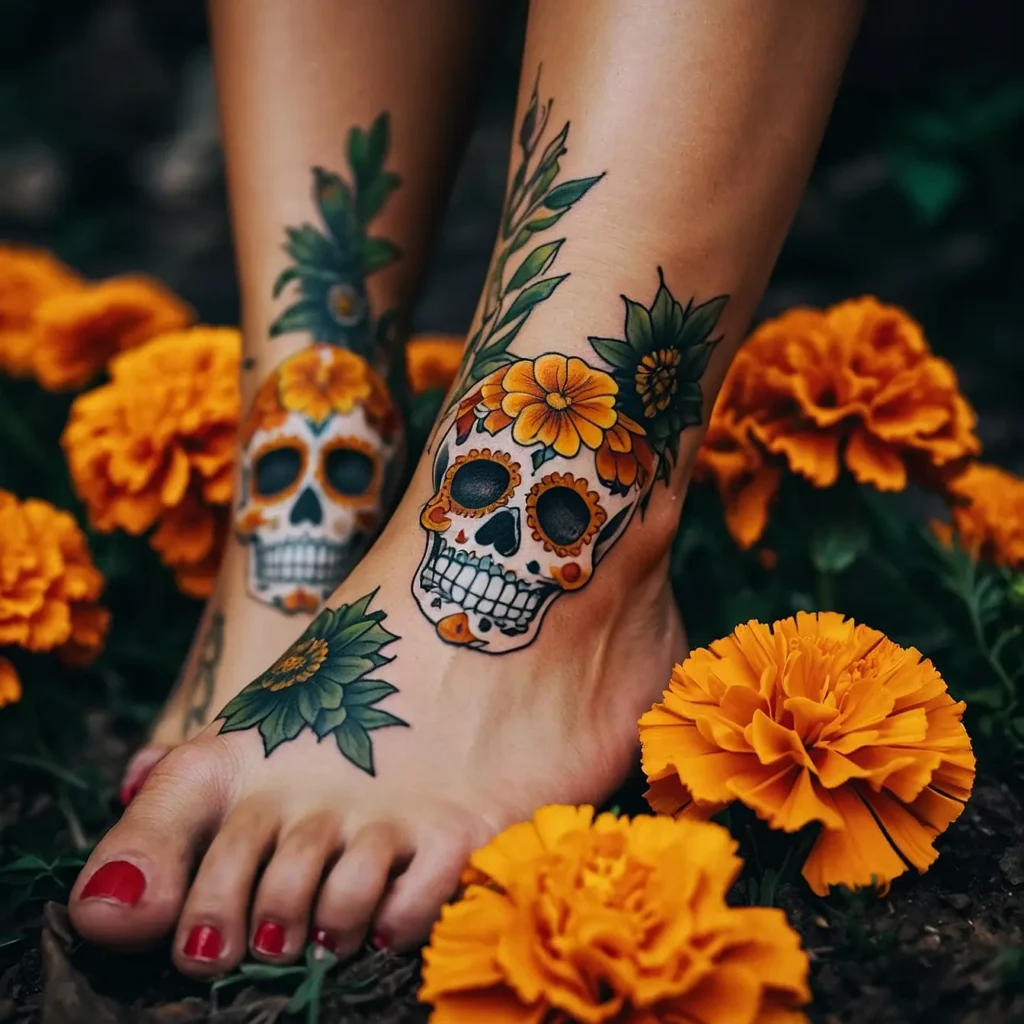 A small sugar skull tattoo with floral accents is a beautiful way to combine life and death symbolism. The flowers represent life, beauty, and the cycle of nature, while the skull acknowledges mortality. This design looks great on the wrist or ankle and can be done in black ink for a minimalist look or with colors to add vibrancy.