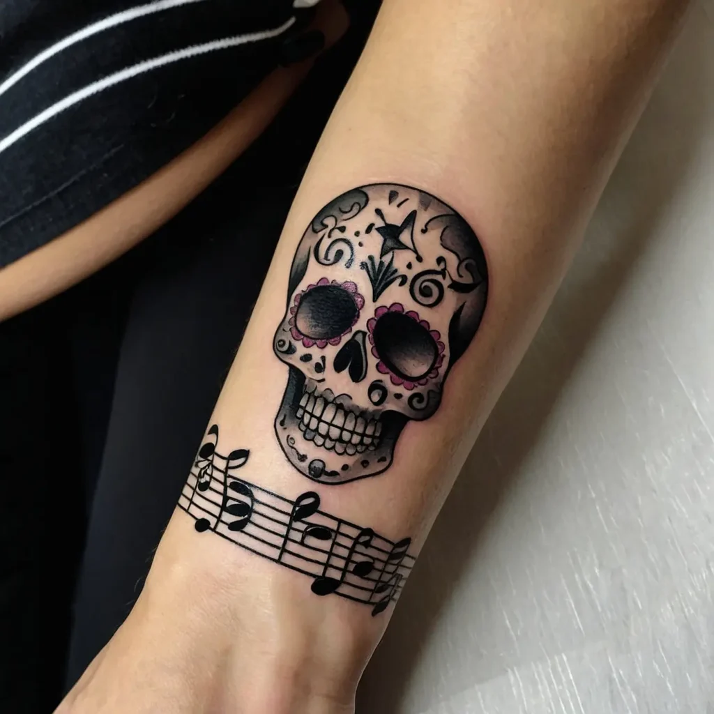 For music lovers, a small sugar skull tattoo with music notes can symbolize the joy and passion that music brings to life, even in times of loss. This design can serve as a tribute to a musician or music lover who has passed away.