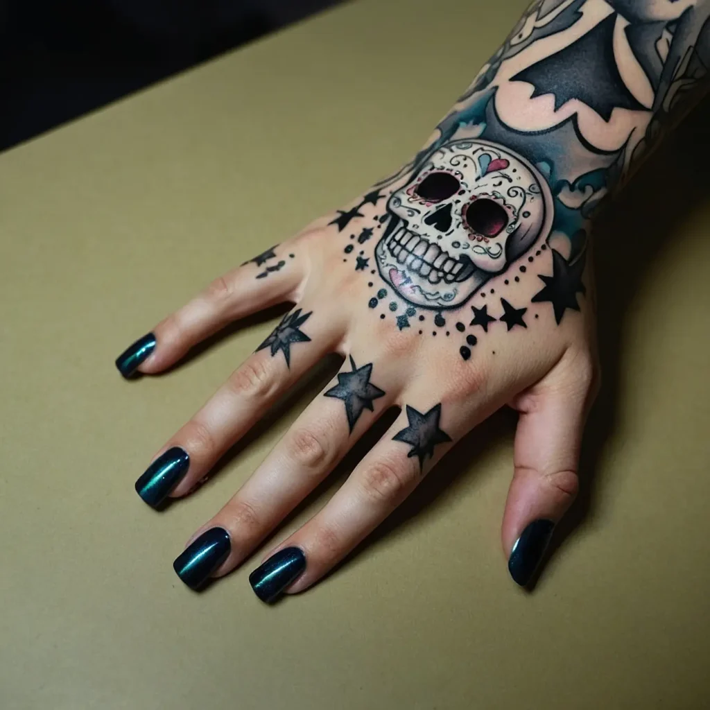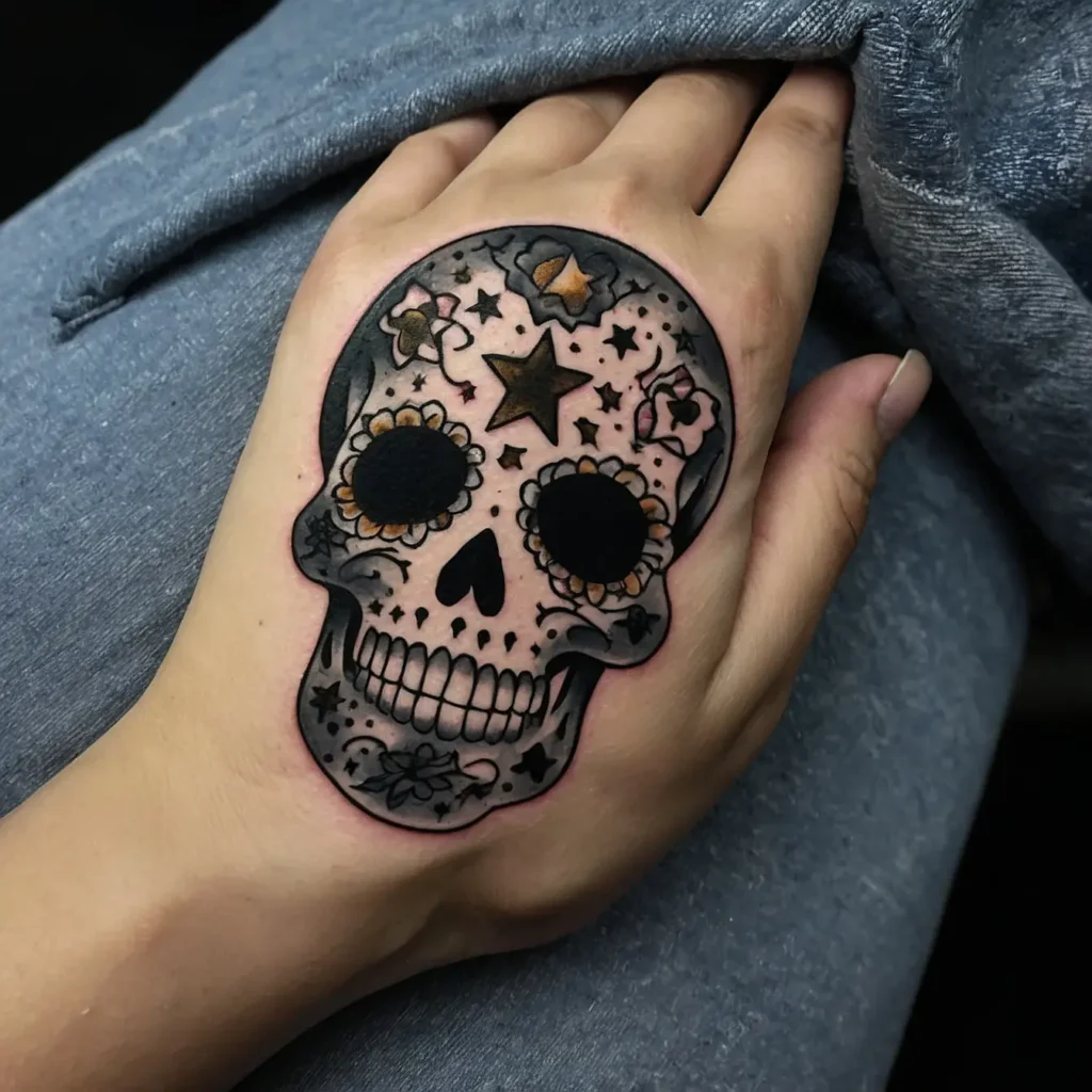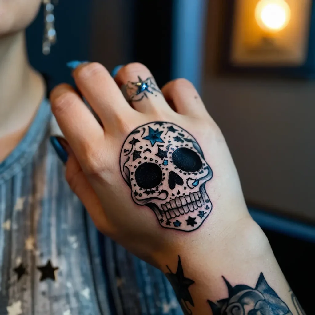 Stars symbolize guidance and protection, often serving as a reminder of the presence of lost loved ones watching over us. A small sugar skull tattoo with stars is both meaningful and visually striking, perfect for a simple but symbolic design.