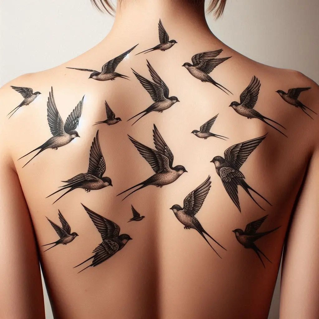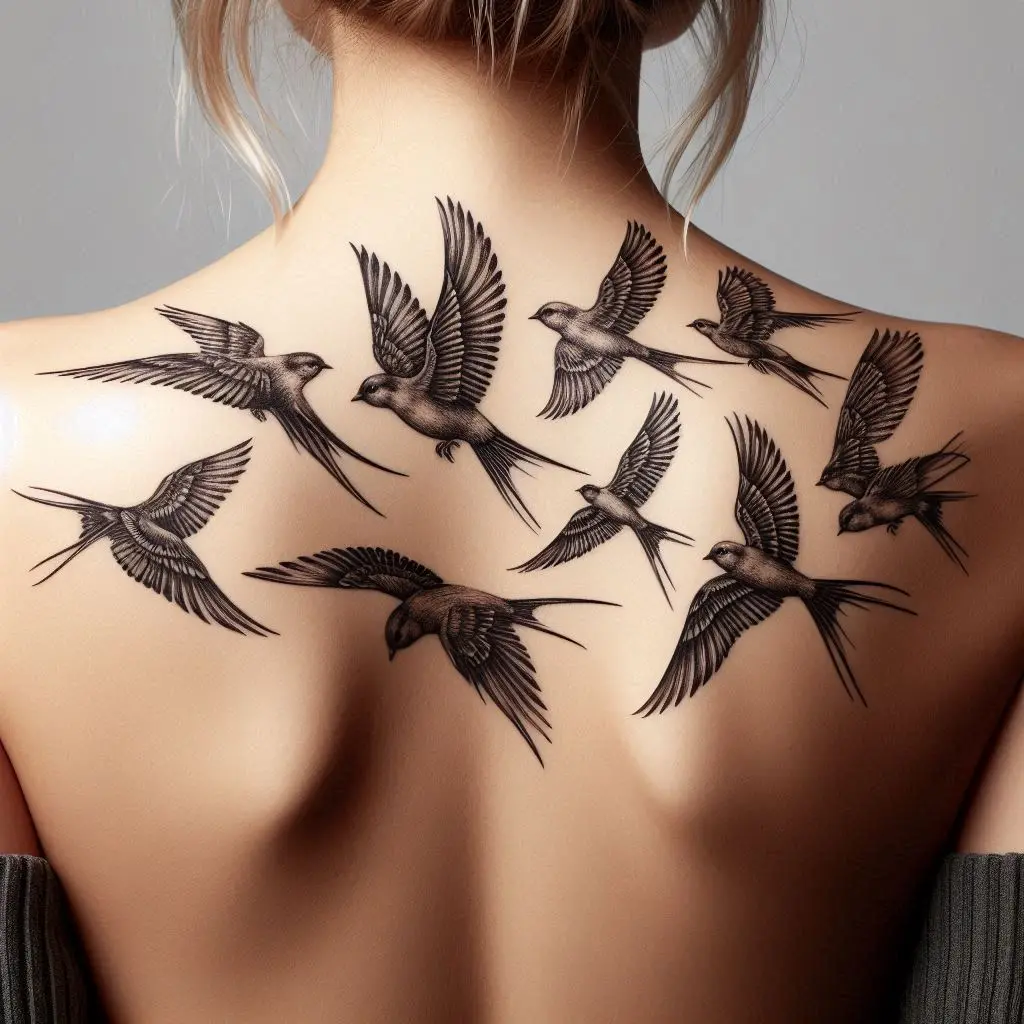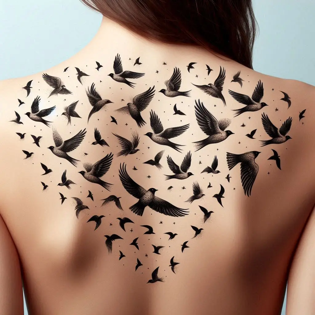 A birds tattoo across the upper back is a classic design that symbolizes freedom and the desire to soar above challenges. Birds in flight can represent independence, new beginnings, and the beauty of life’s journey.