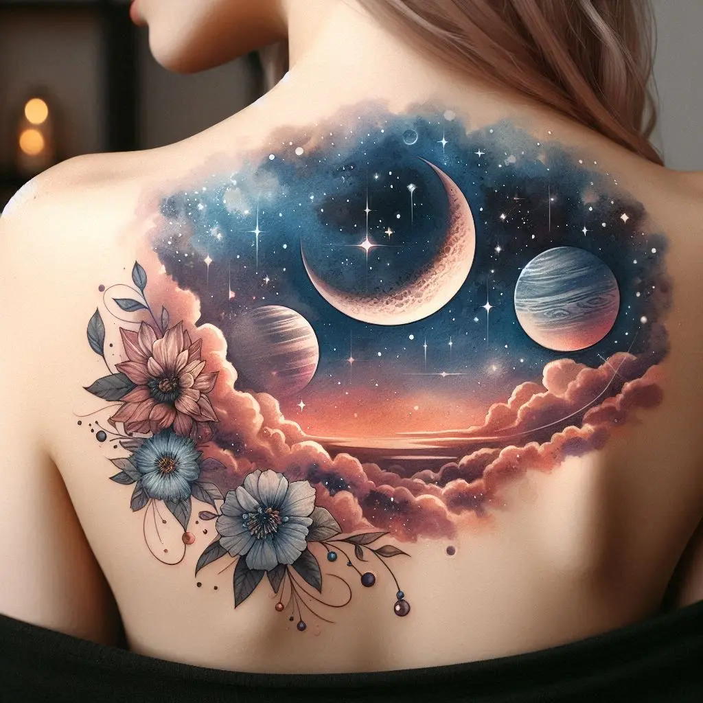10. Celestial Scene Upper Back Tattoo