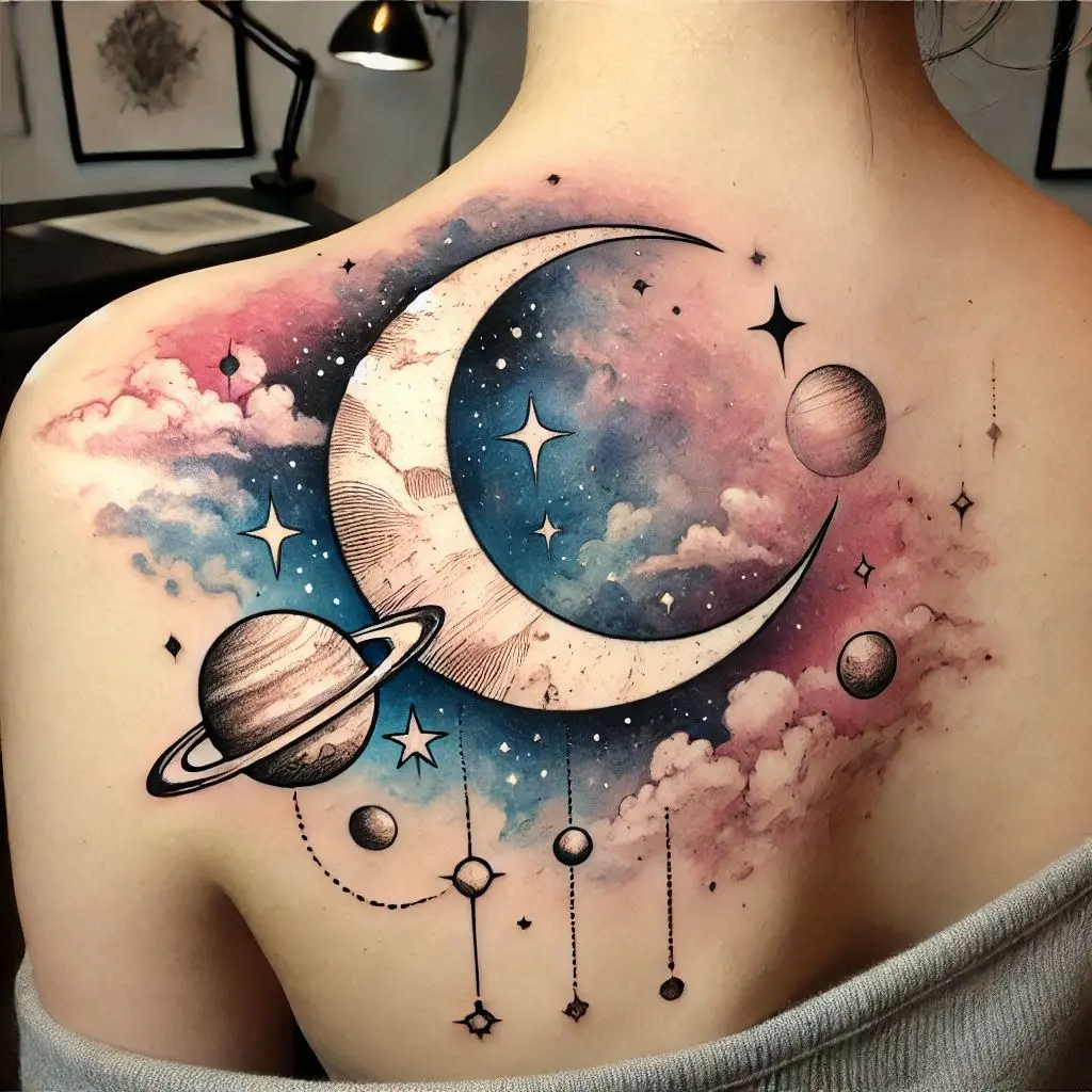 A celestial tattoo featuring stars, moons, and planets is a fantastic idea for an upper back design. These elements are often associated with spirituality, the cosmos, and our place in the universe.