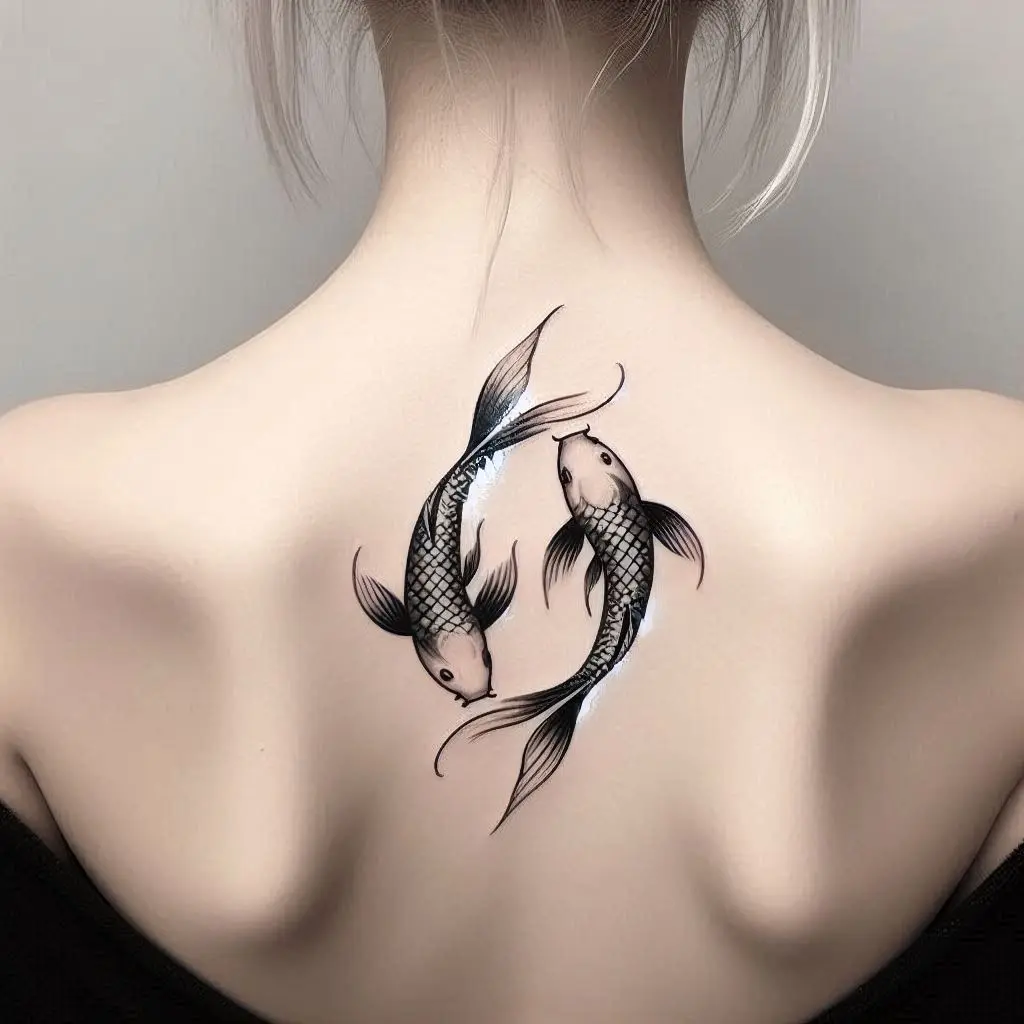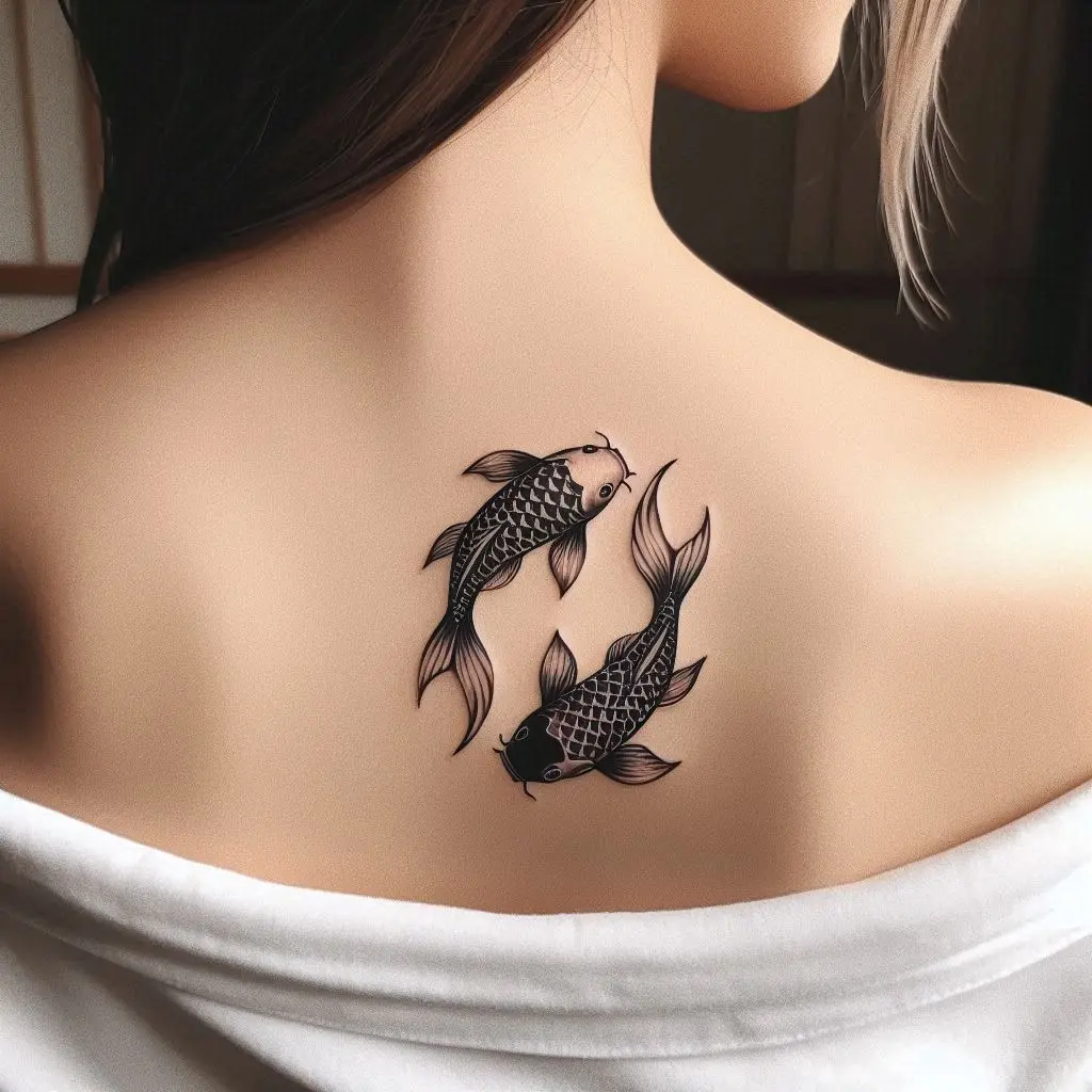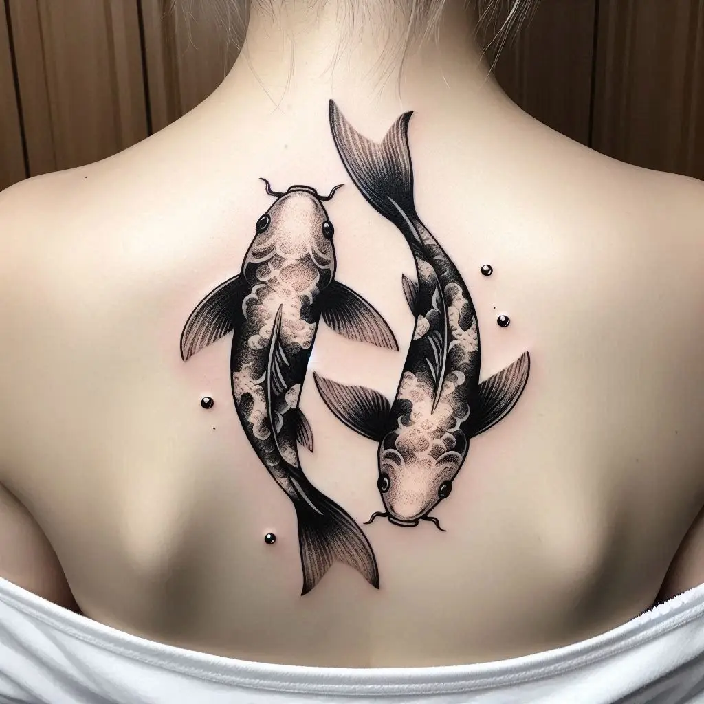 Koi fish tattoos are meaningful in many cultures, especially Japanese. The koi fish represents perseverance, strength, and good fortune, making it an excellent choice for an upper back tattoo.
