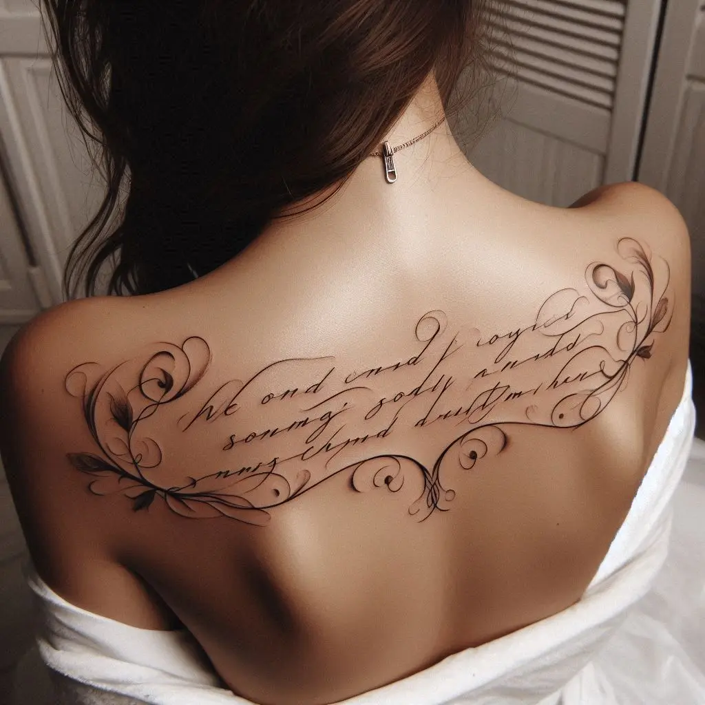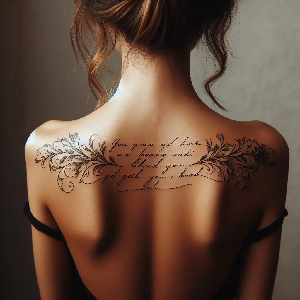 Quote tattoos are a perfect way to express your beliefs, inspiration, or personal motto. A quote tattoo across the upper back is a bold way to display a message that has deep meaning for you. Whether it’s a line from a favorite book, song, or something you’ve lived by, it will be a constant source of motivation and reflection.