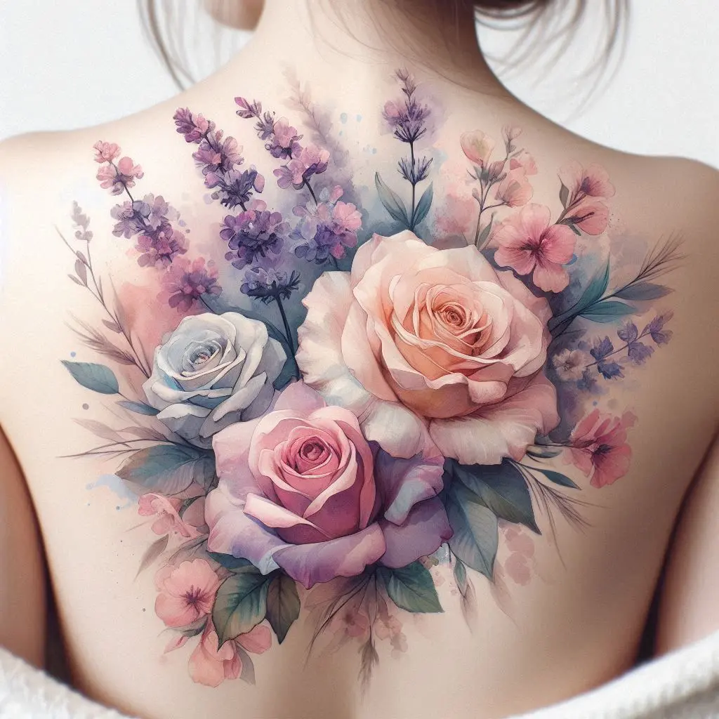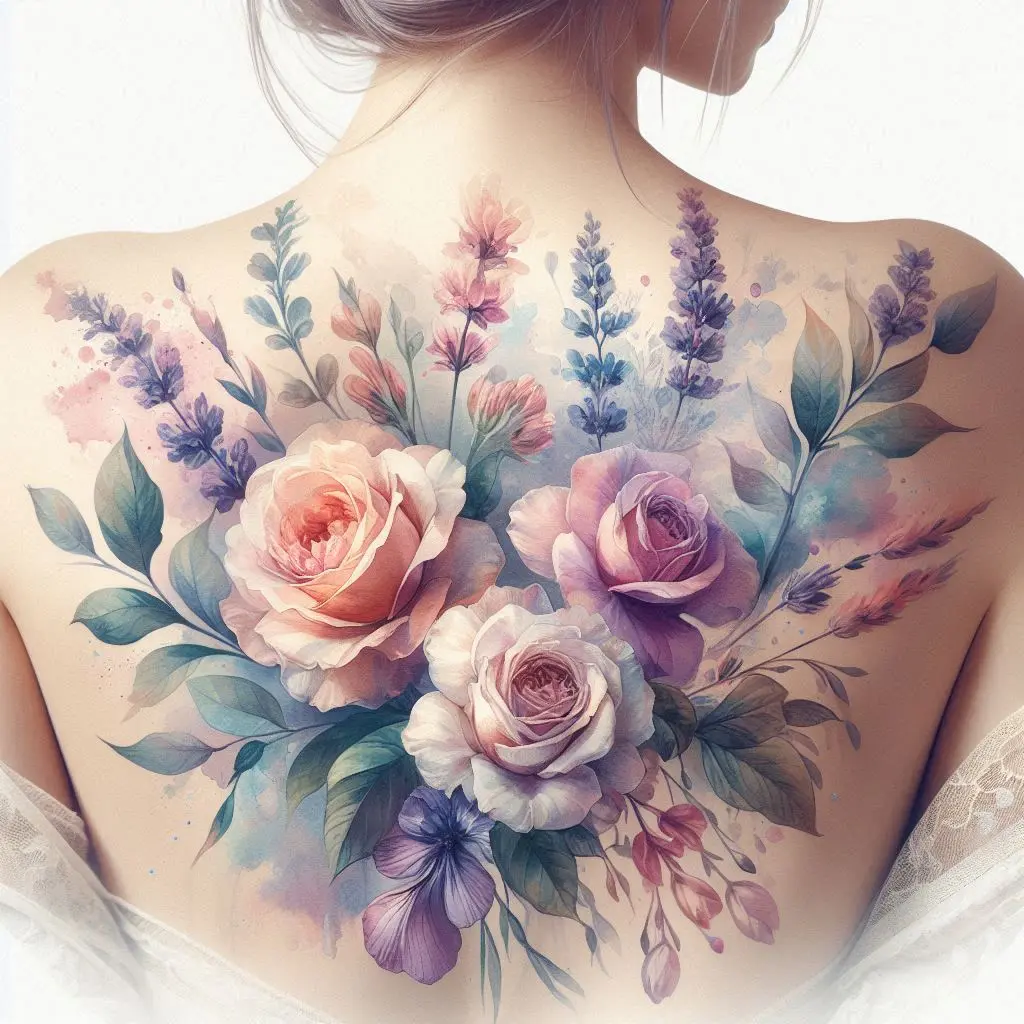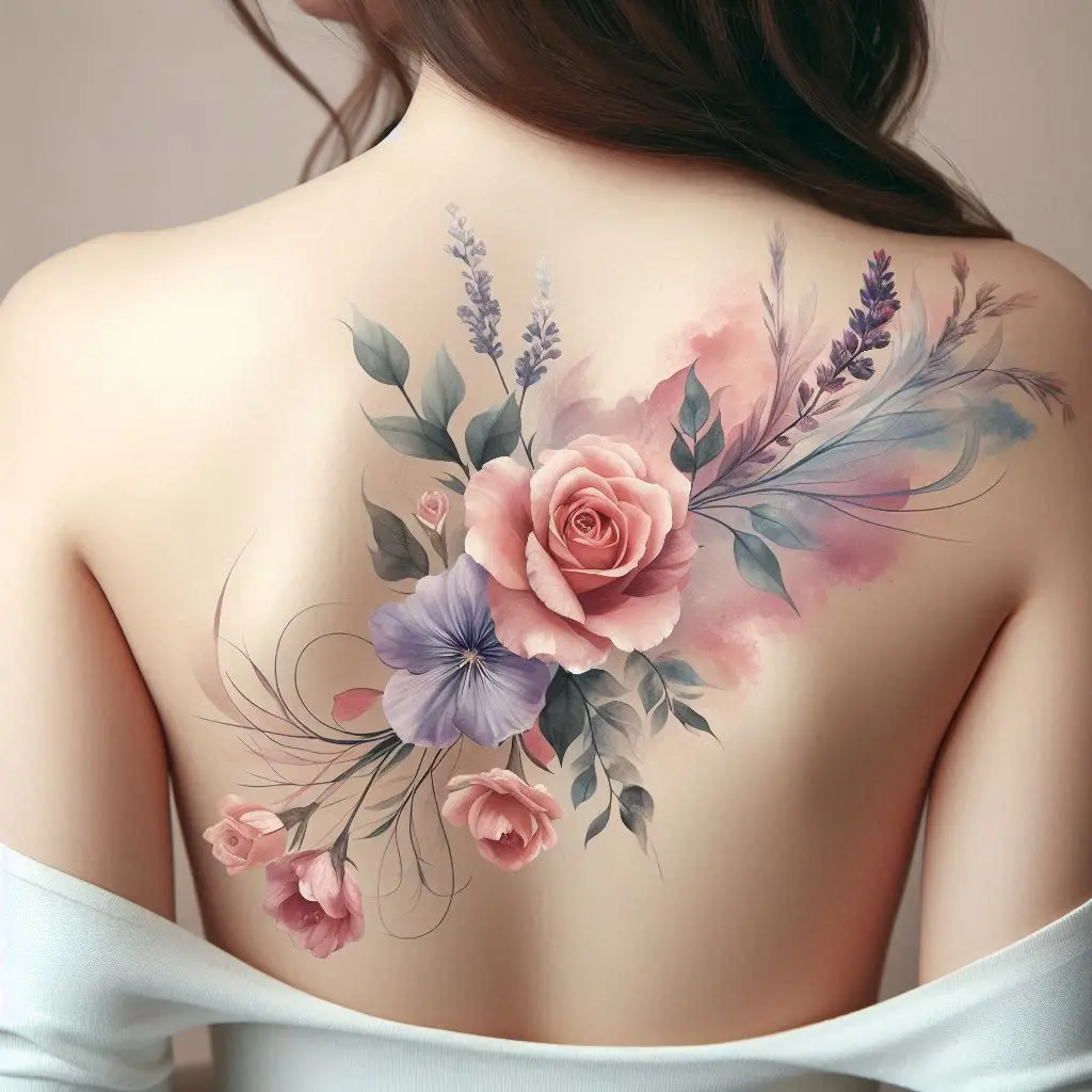 A watercolor floral bouquet on the upper back creates a soft and feminine tattoo. Watercolor tattoos have a dreamy, artistic vibe that makes the flowers feel like they’re alive.