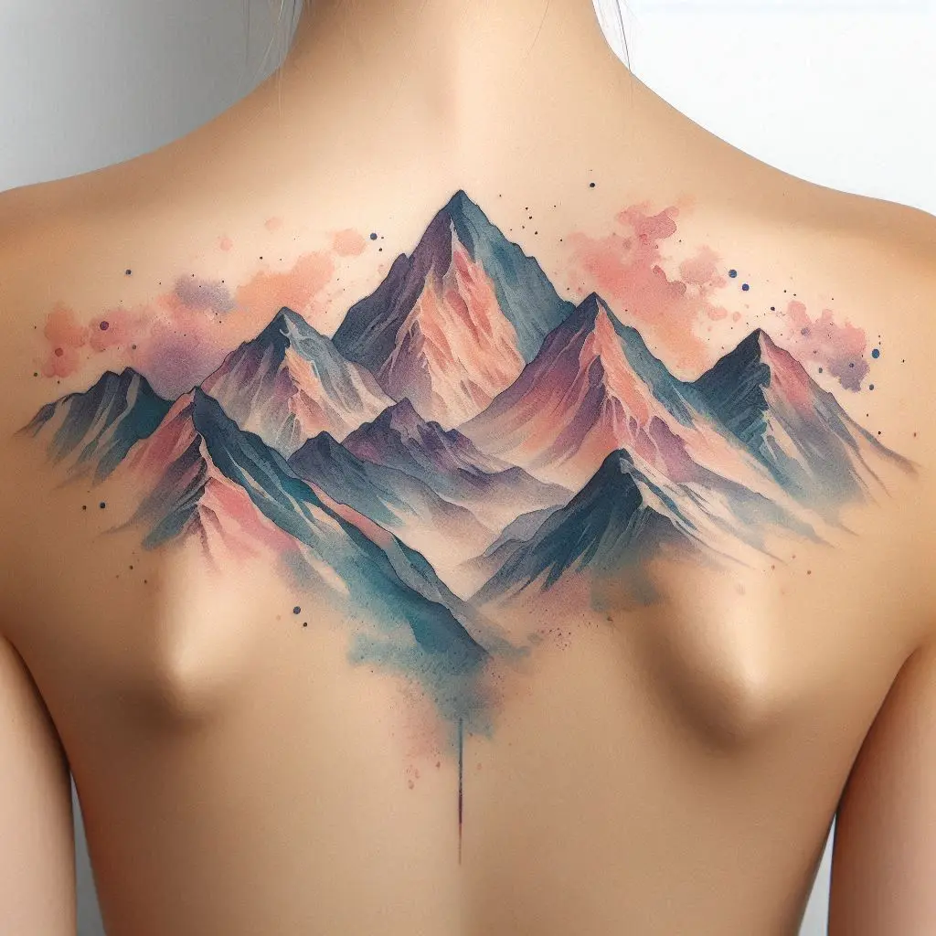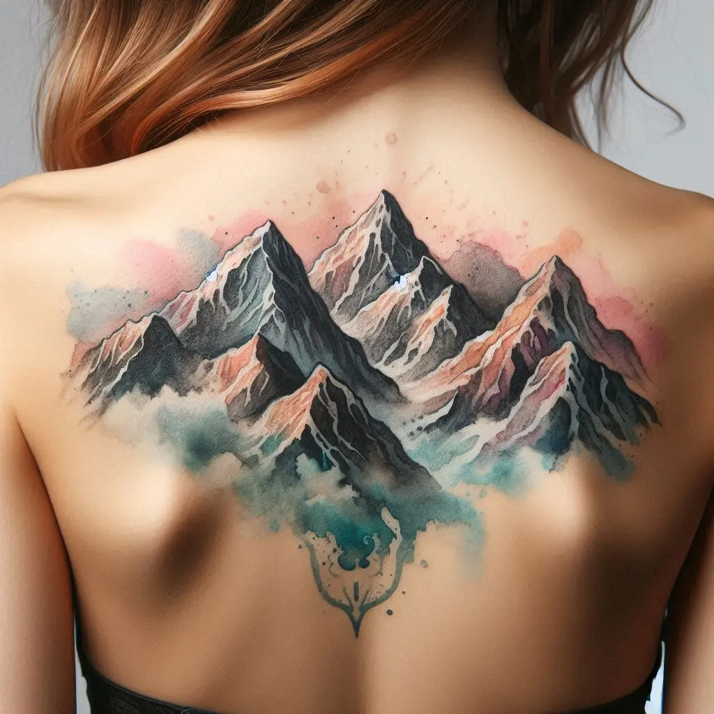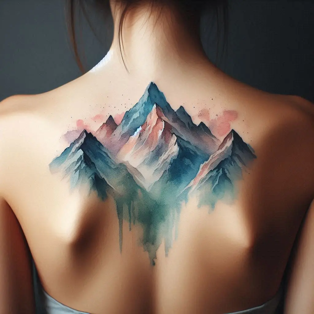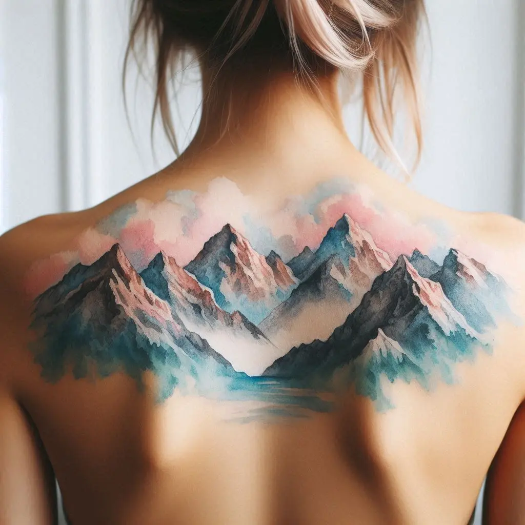 A watercolor mountainscape on the upper back captures the beauty of nature and the spirit of adventure. The flowing colors and majestic peaks represent overcoming obstacles and the journey of life.