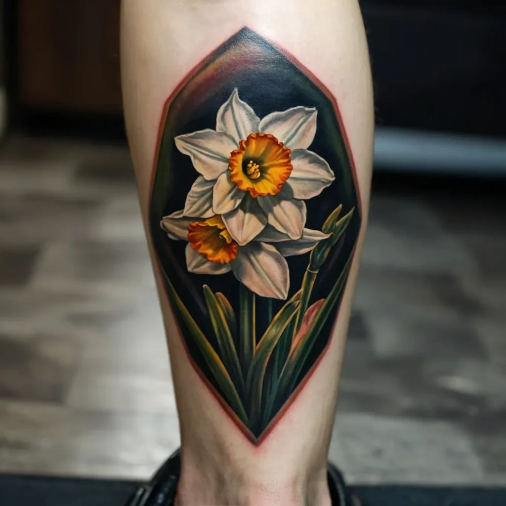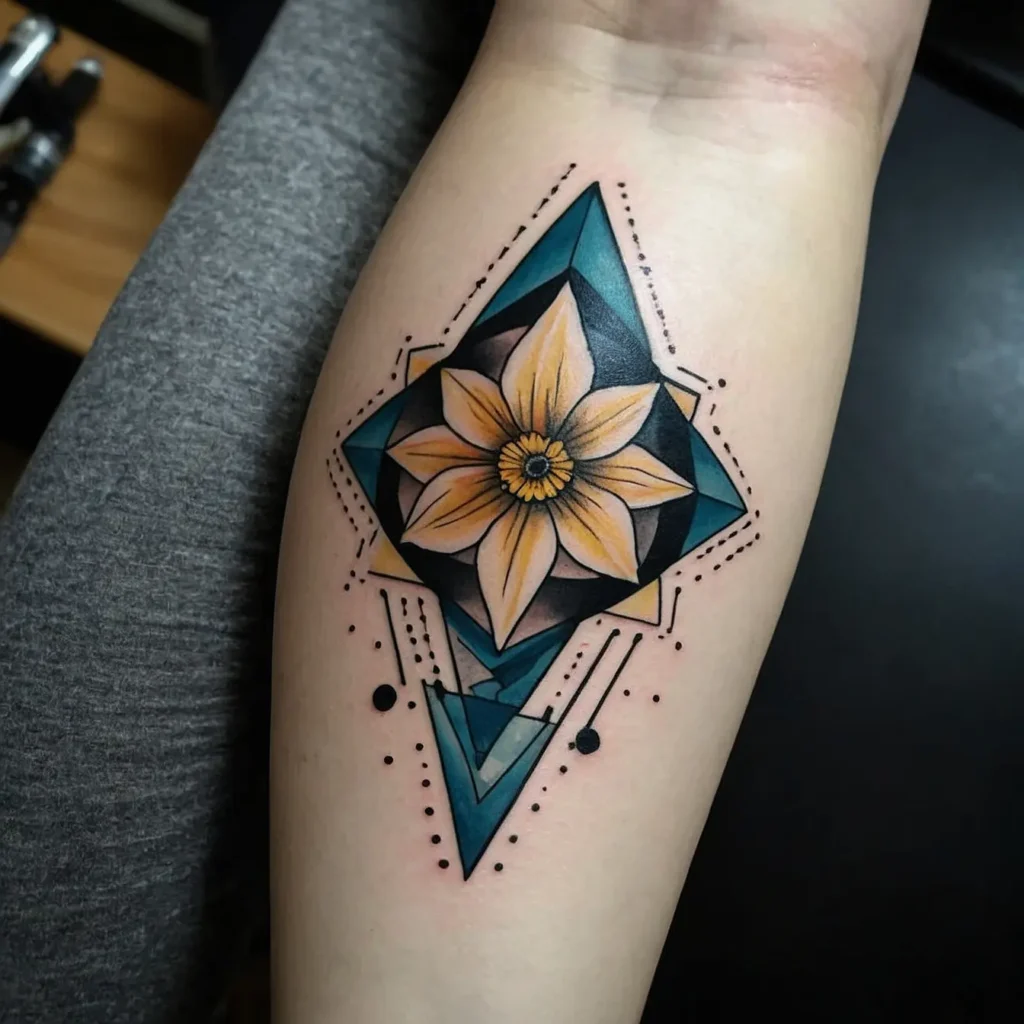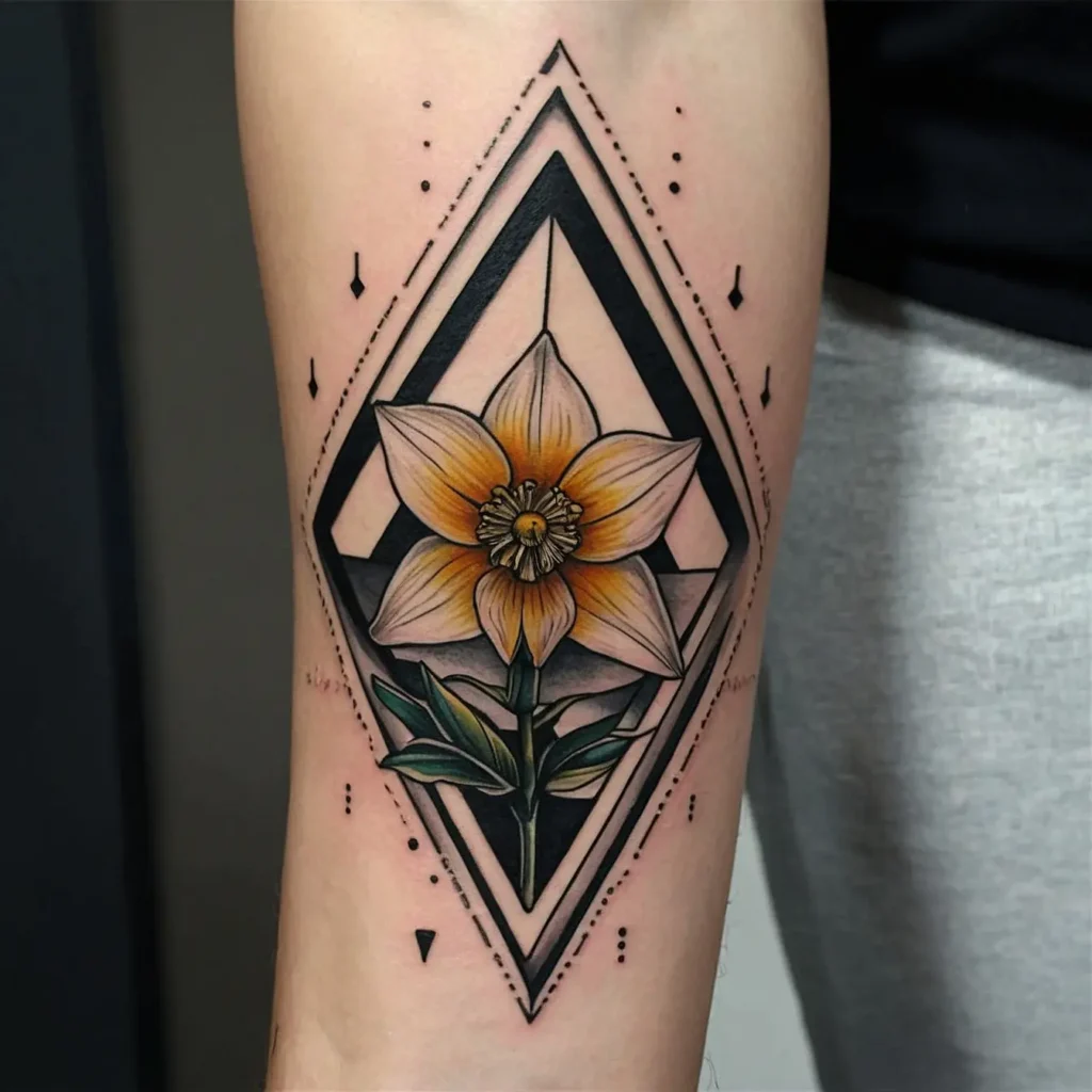 Integrating geometric shapes with the narcissus flower creates a modern look. This design represents balance and harmony, making it a stylish choice for contemporary tattoo enthusiasts.