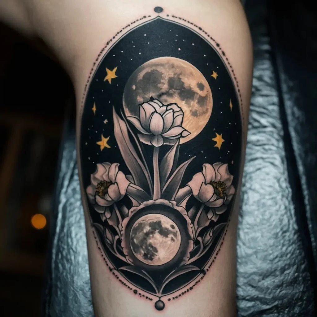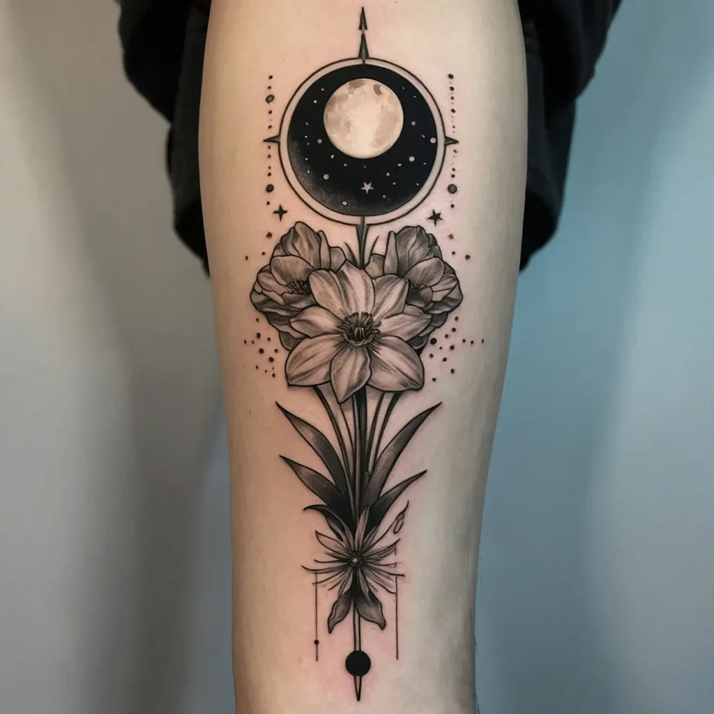 Featuring the narcissus flower alongside the phases of the moon symbolizes cycles and growth. This tattoo is ideal for those who appreciate nature and the universe’s rhythms.