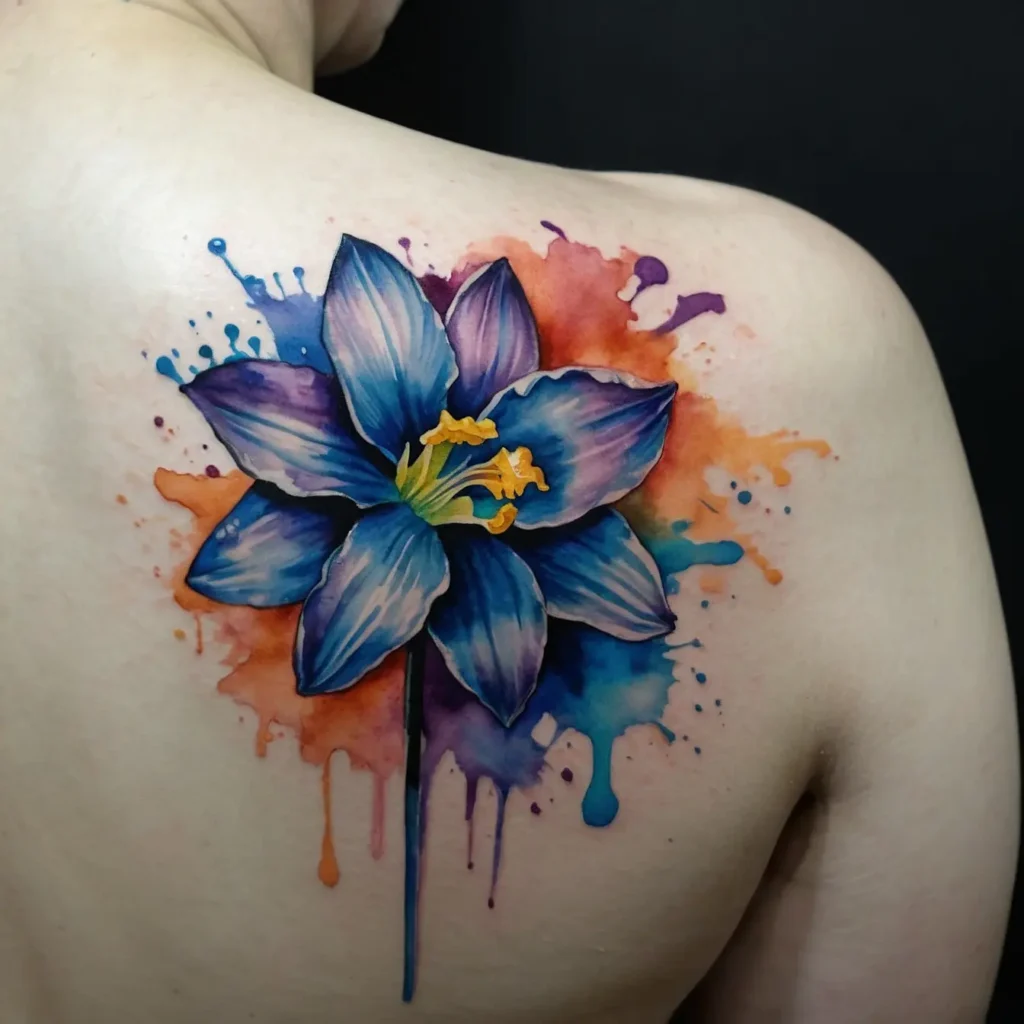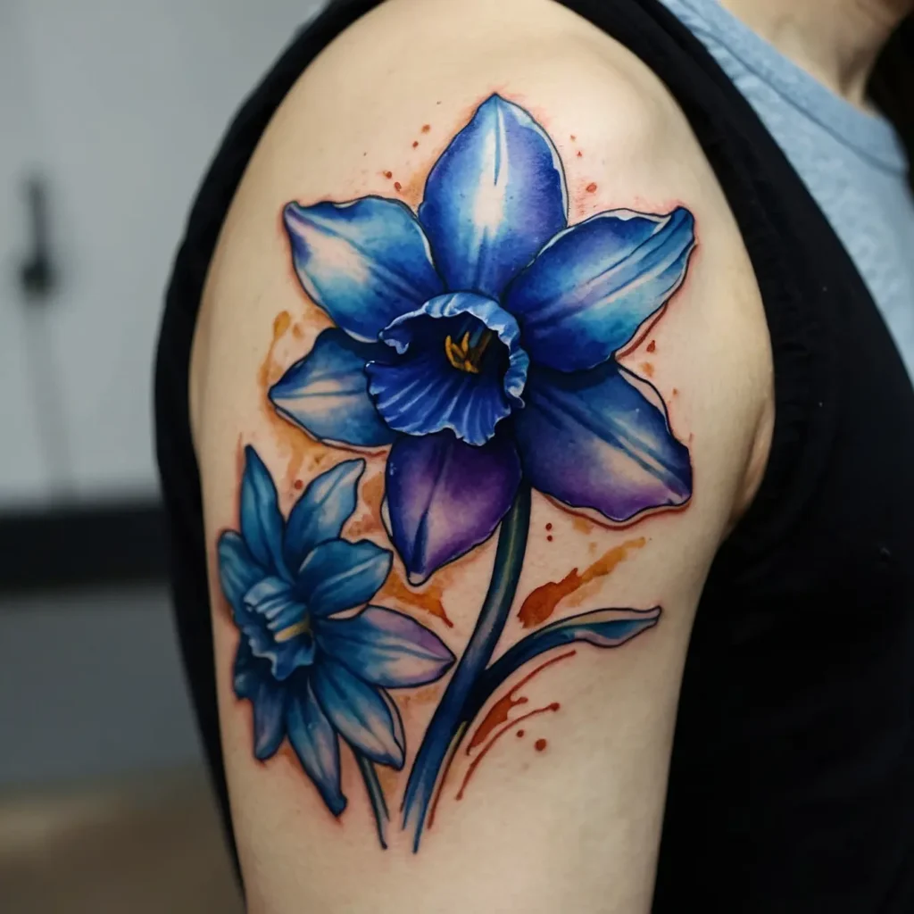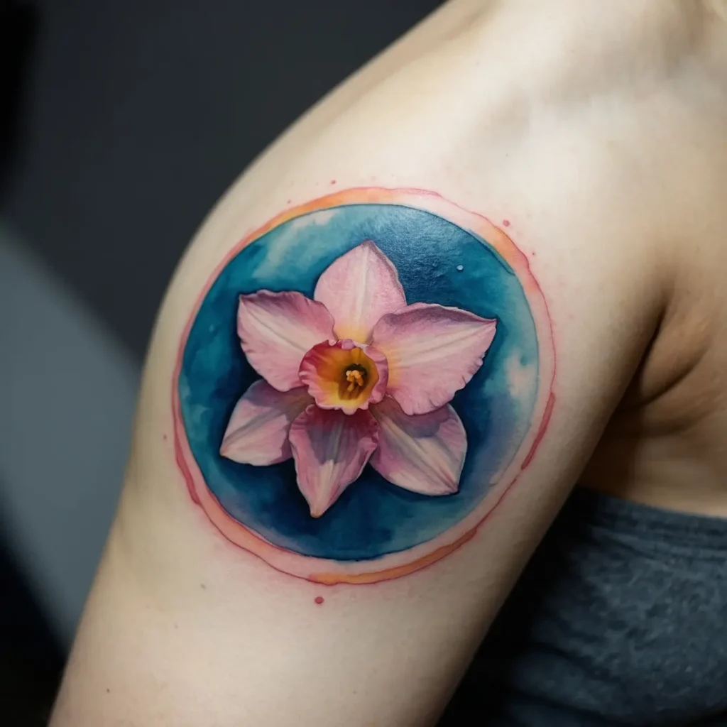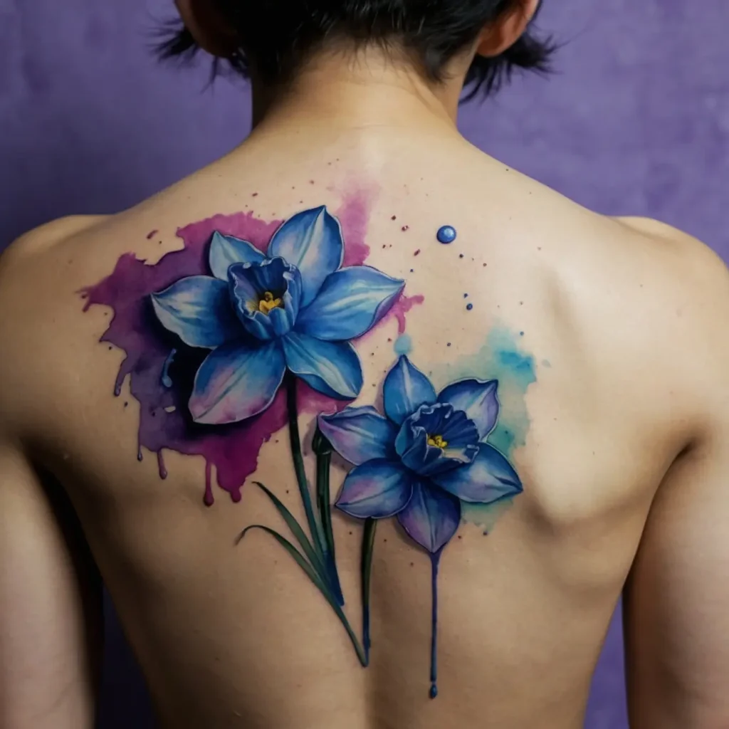 A vibrant watercolor design brings the narcissus to life. The flowing colors represent the joy and vibrancy of life. This tattoo is ideal for those who want to convey a sense of liveliness and creativity.