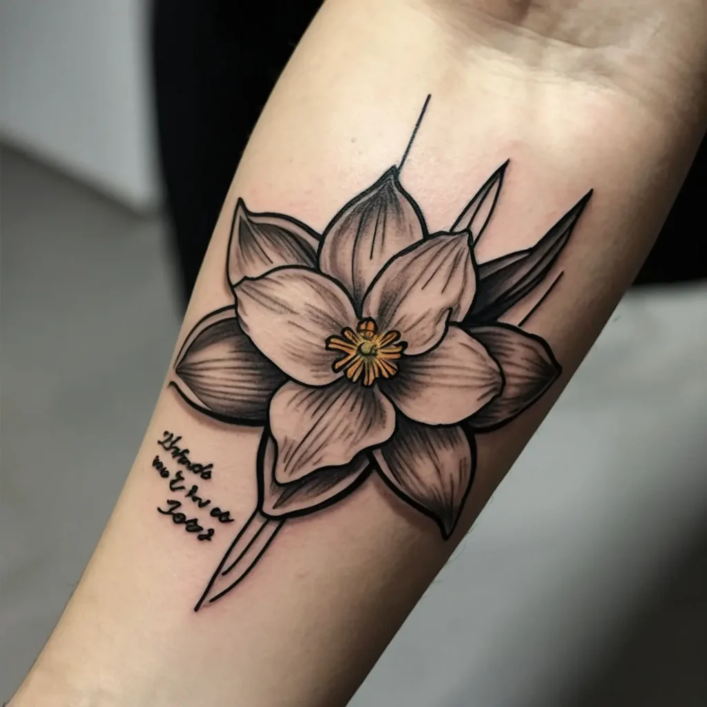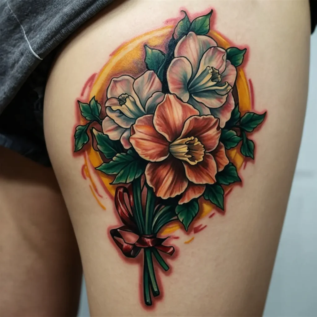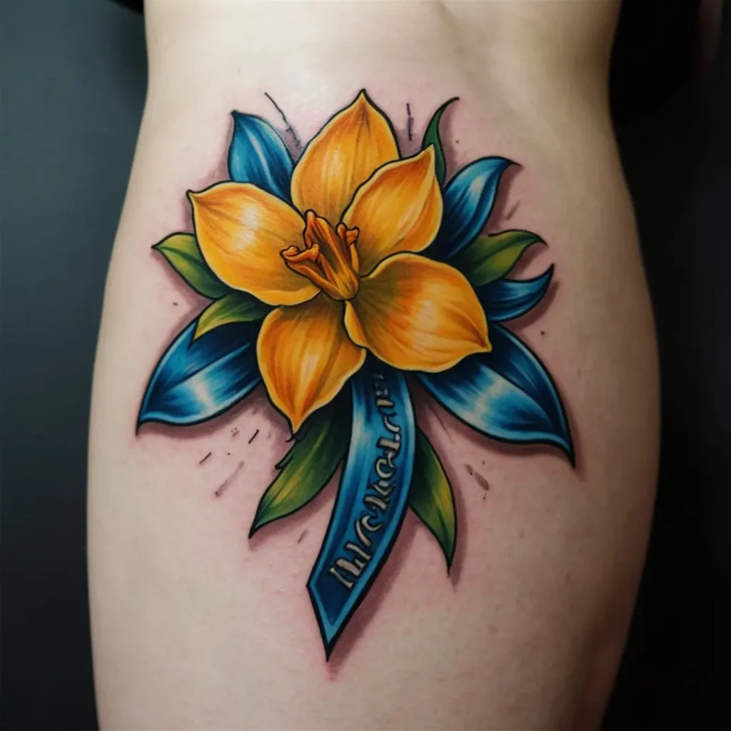 Incorporating a ribbon banner with a meaningful phrase or name alongside the narcissus adds a personal touch. This tattoo is perfect for someone wanting to honor a loved one.