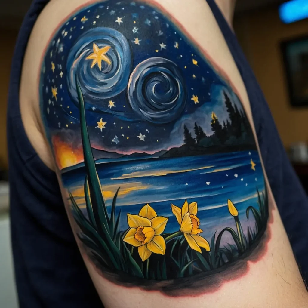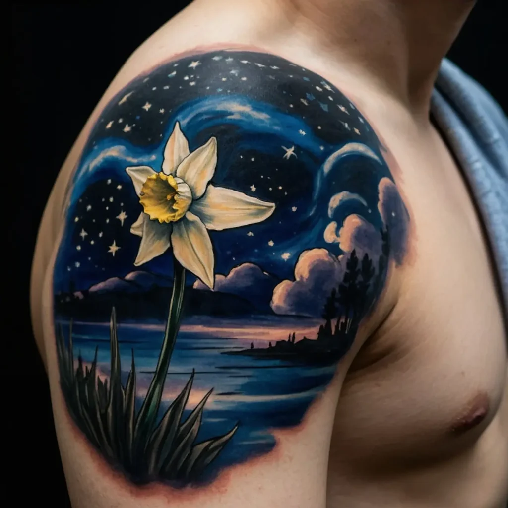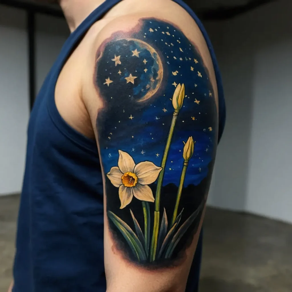 Incorporating a starry night background with the narcissus flower adds a magical touch. This design represents dreams and aspirations, making it ideal for those who are reaching for the stars.