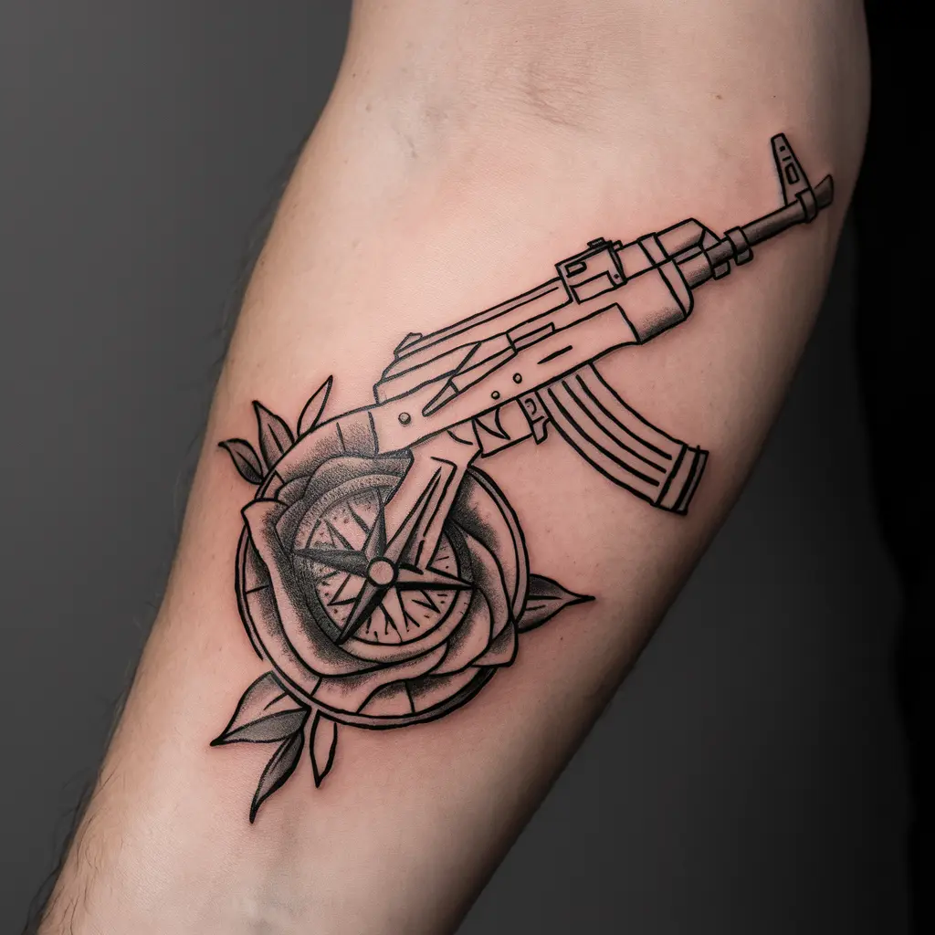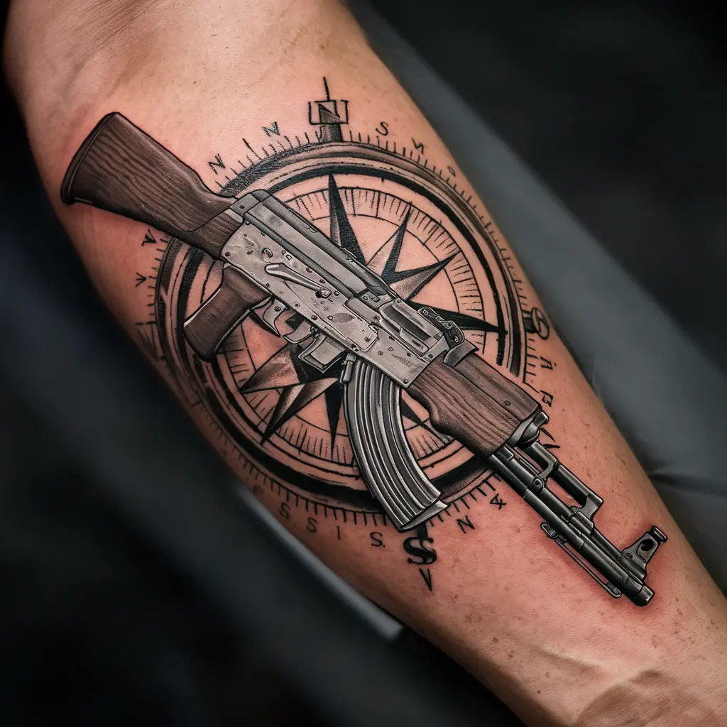 If you love the idea of survival and adventure, an AK47 combined with a compass can symbolize your journey through life and the strength to follow your own path, no matter where it leads.