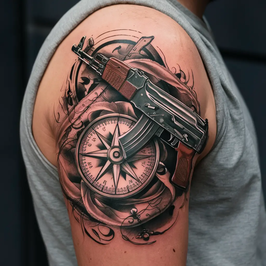 Placement: The upper arm, side of the rib cage, or back are perfect for this kind of design, giving it enough room for both the AK47 and the compass to be clearly defined.