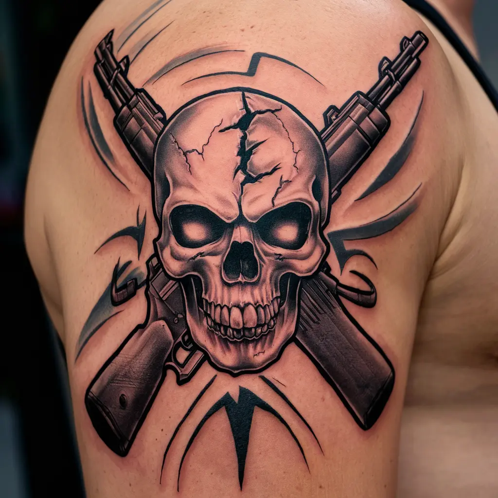 Placement: The upper arm, chest, or side of the rib cage would make a great placement for this tattoo, as these areas allow enough room for the skull and AK47 to be designed with lots of detail.