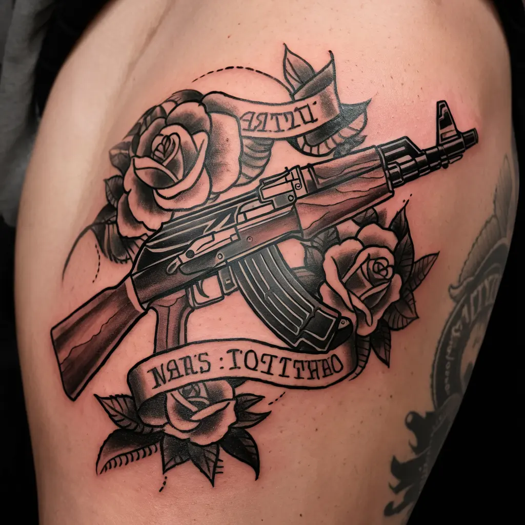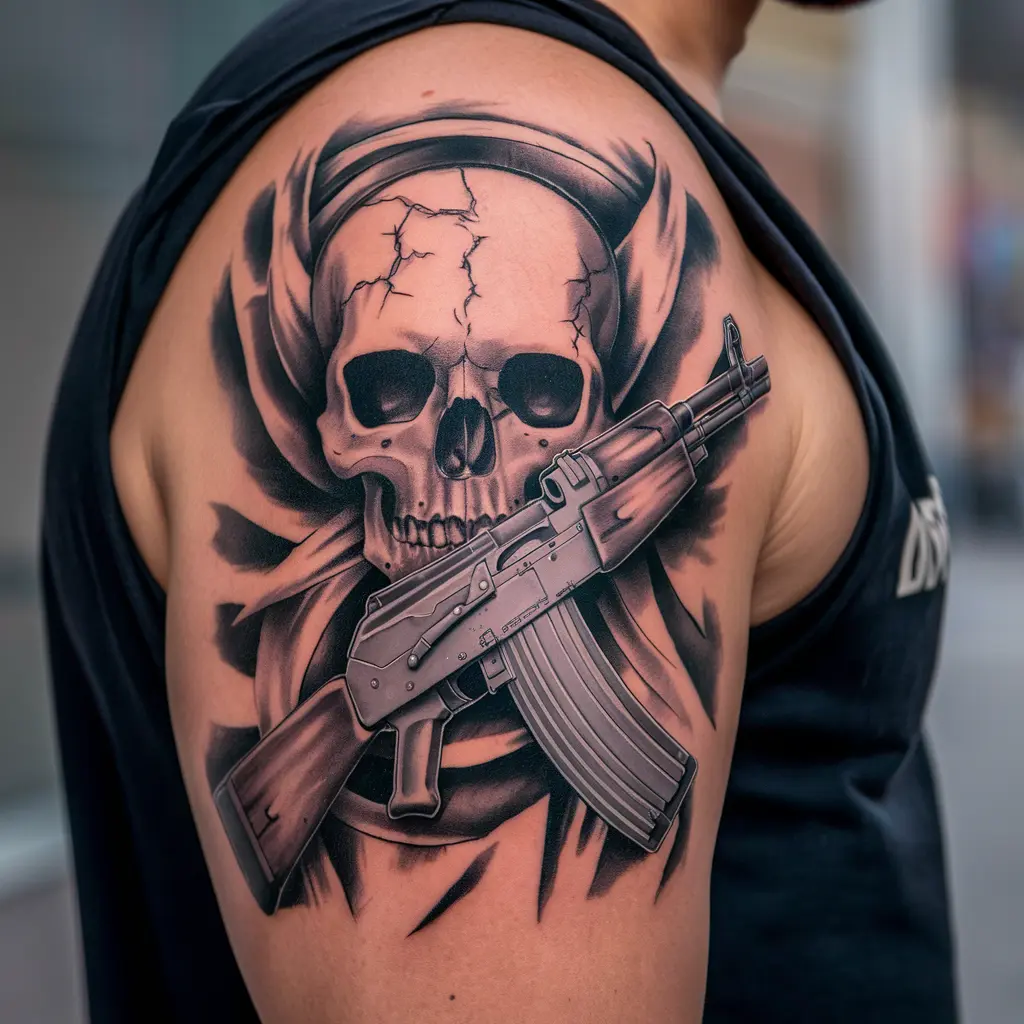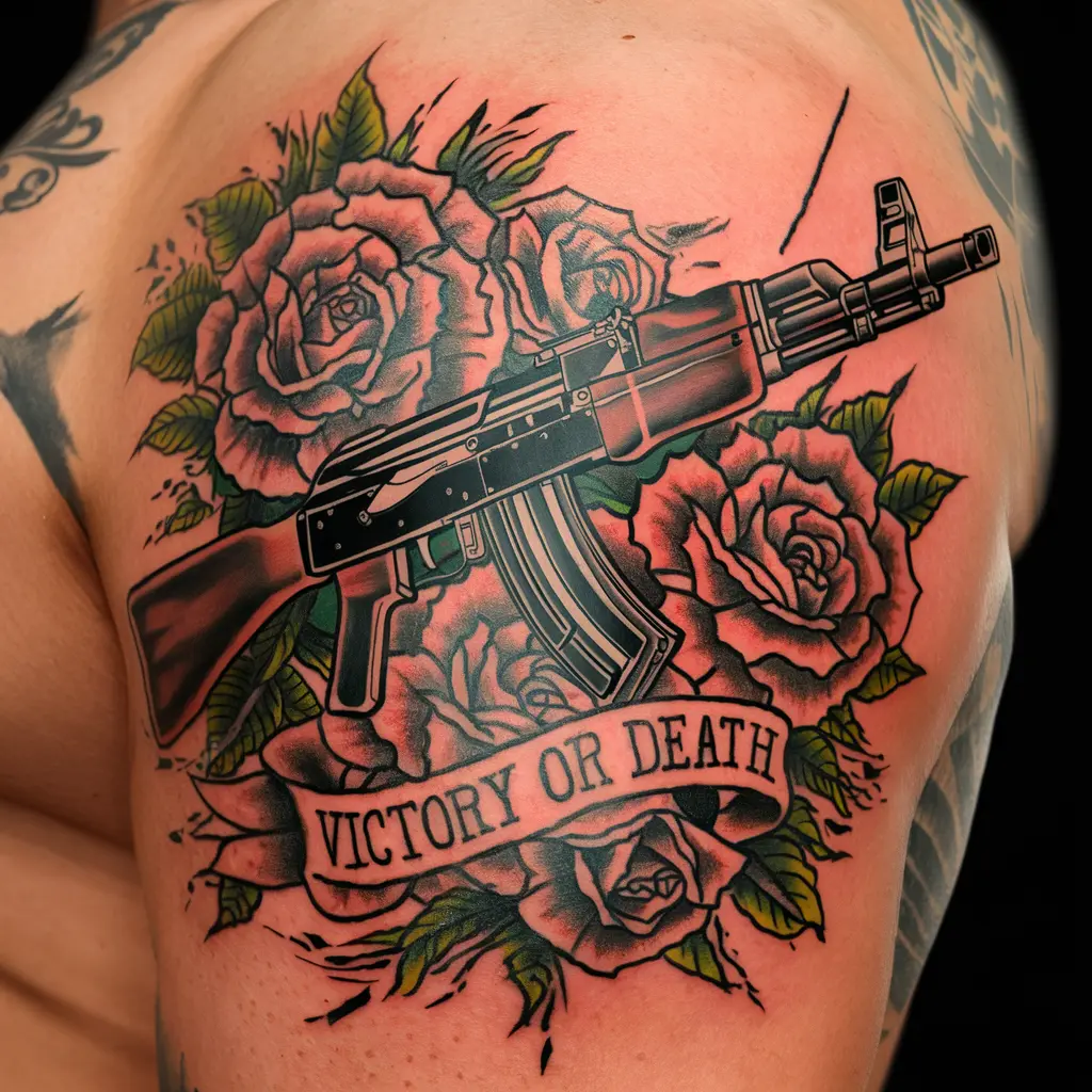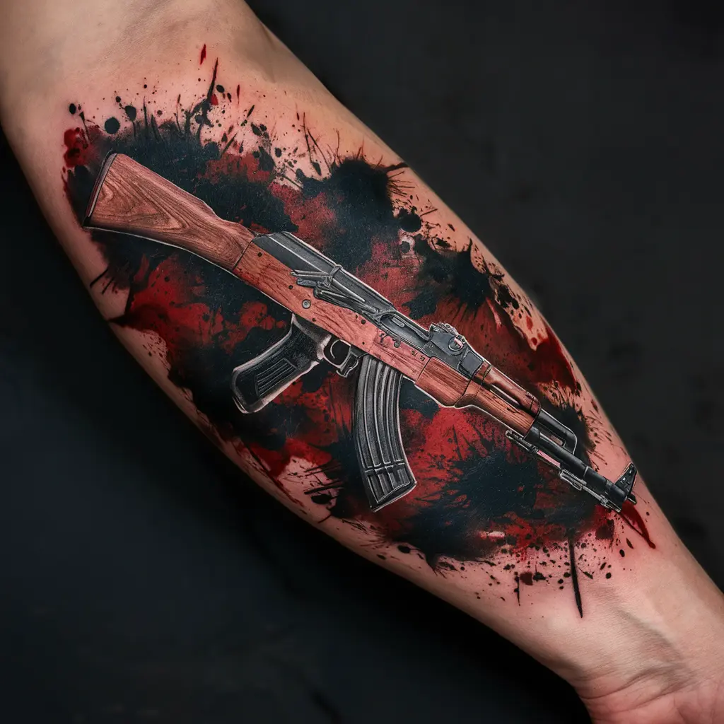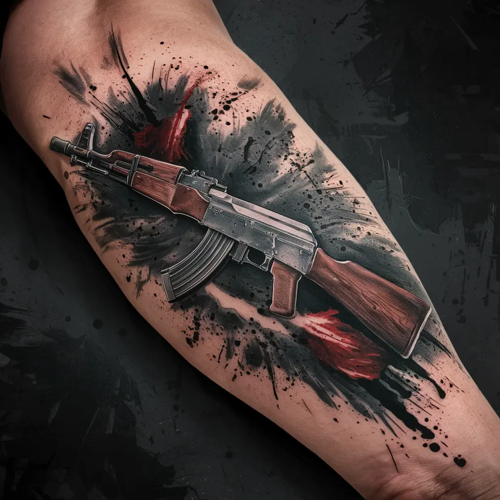 If you’re looking for something that screams intensity, an AK47 tattoo with blood splatter can capture the raw force and chaos associated with the weapon.